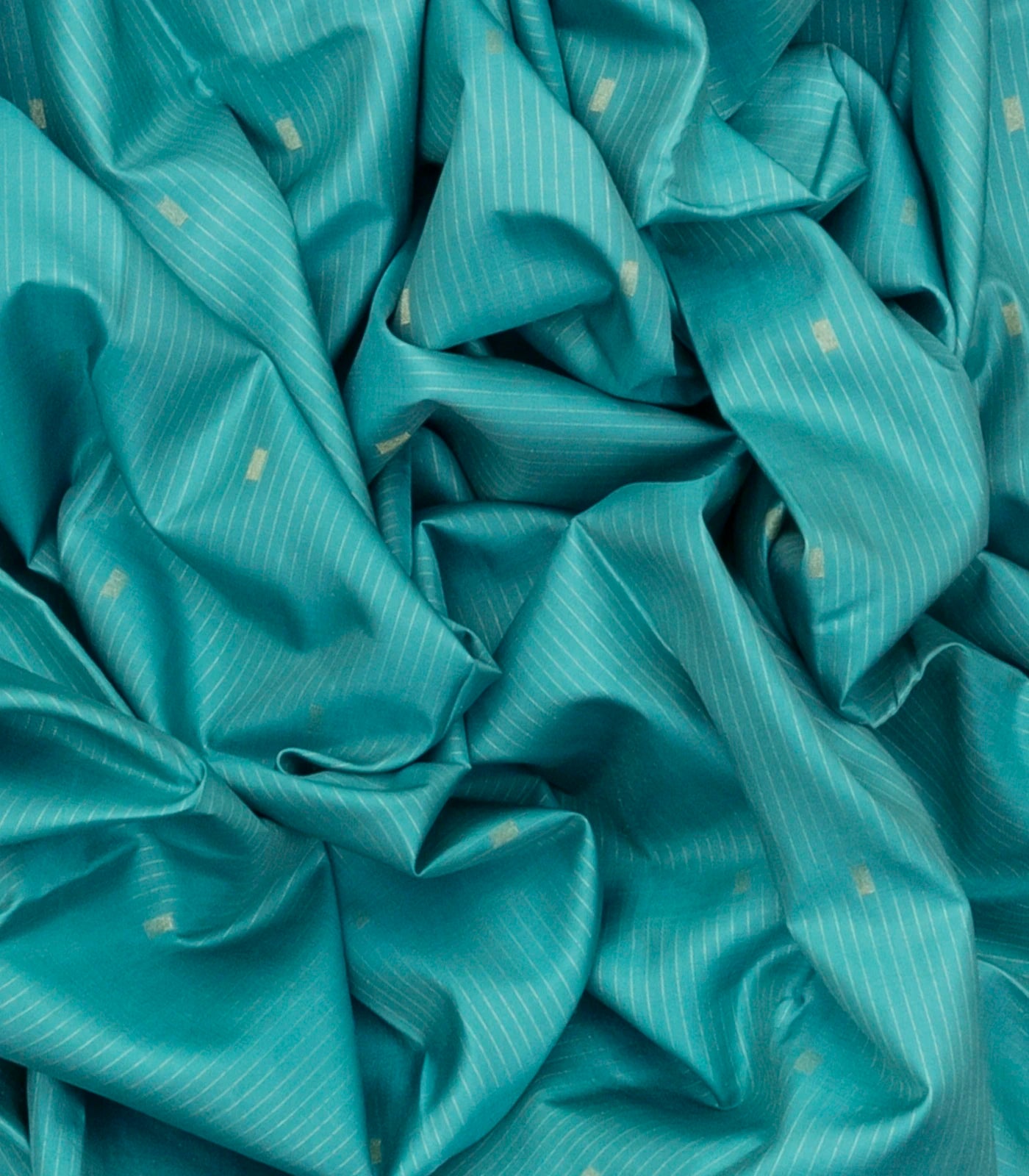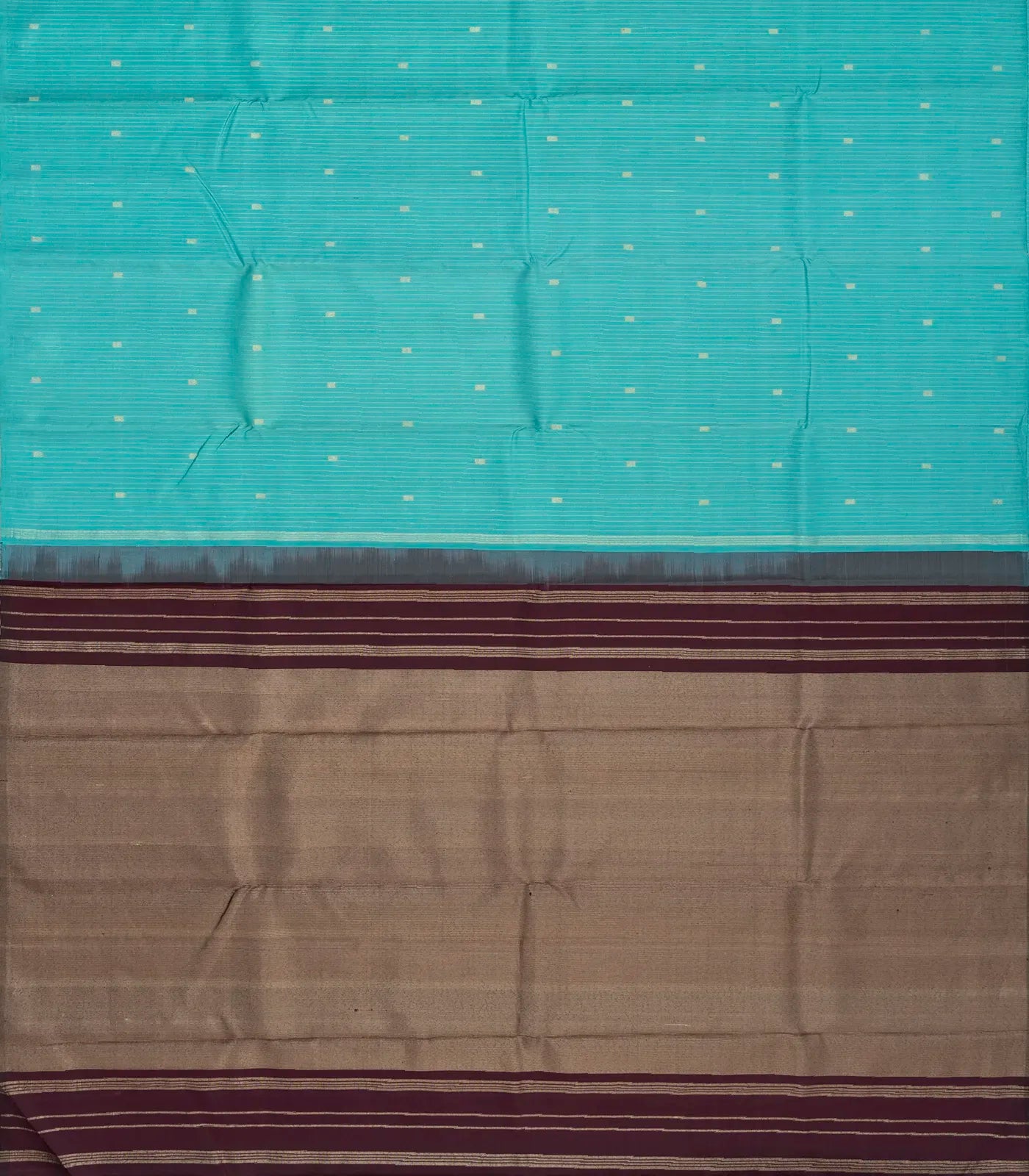 This handwoven kanchipuram silk saree is filled with zari stripes in turquoise body along with contrast maroon pallu
