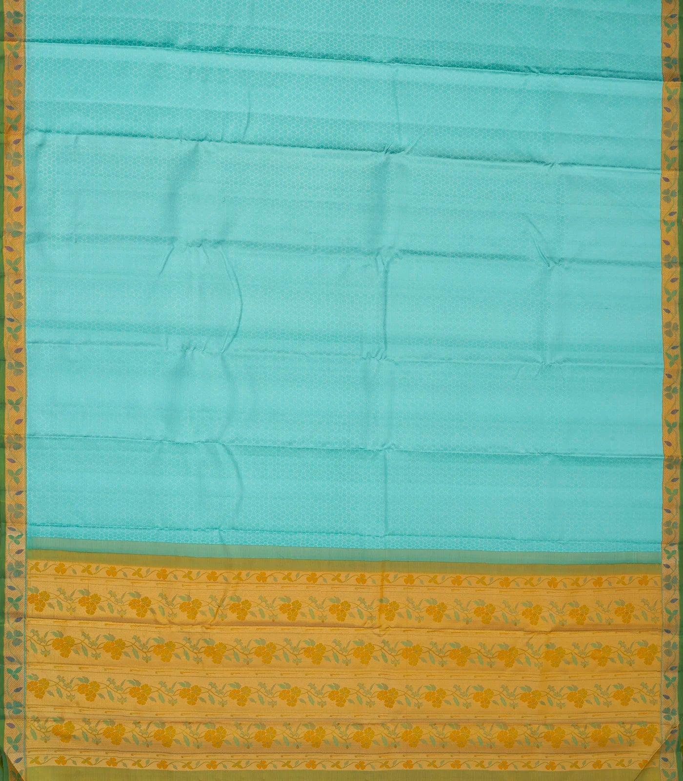 This handwoven kanchipuram silk saree is filled with honey comb motifs in turquoise body along with meena floral motifs in border and pallu