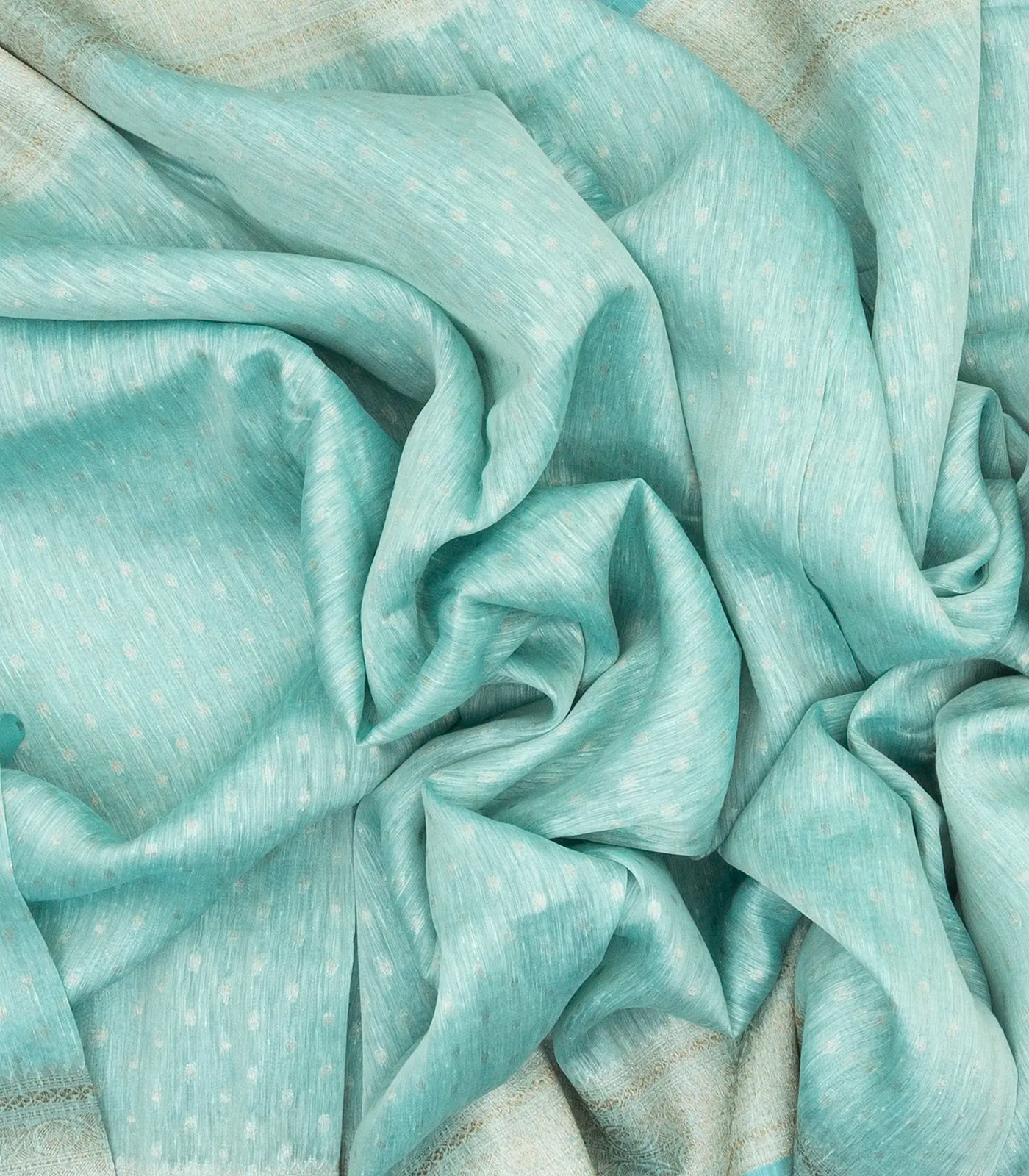 This handwoven linen saree is filled with floral motifs in turquoise body along with border and pallu