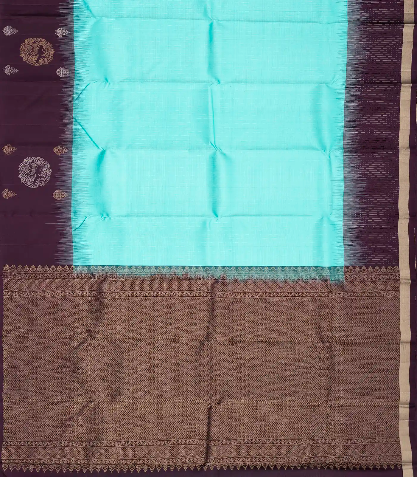 This handwoven soft silk saree is filled with zari checks in turquoise body along with contrast border and pallu