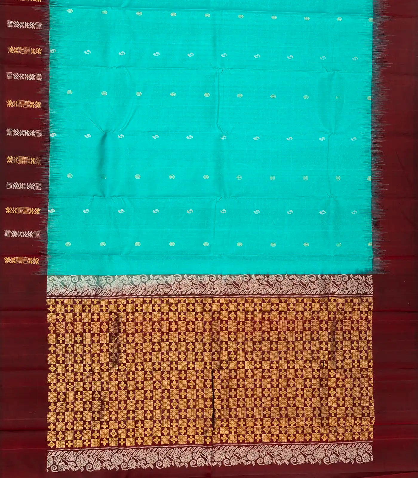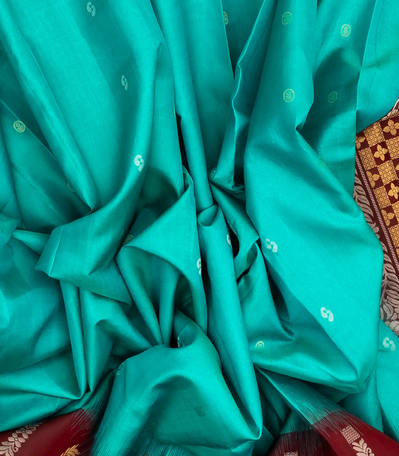 This handwoven soft silk saree is filled with floral zari buttas in turquoise body along with contrast maroon border and pallu