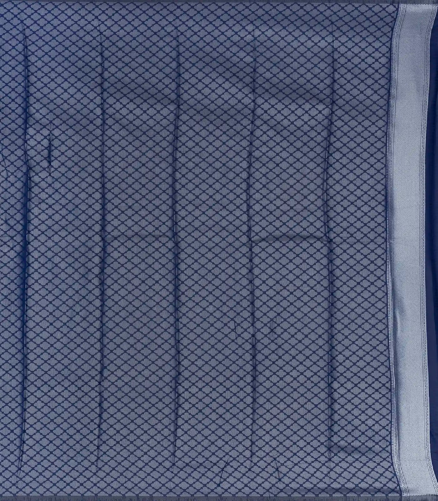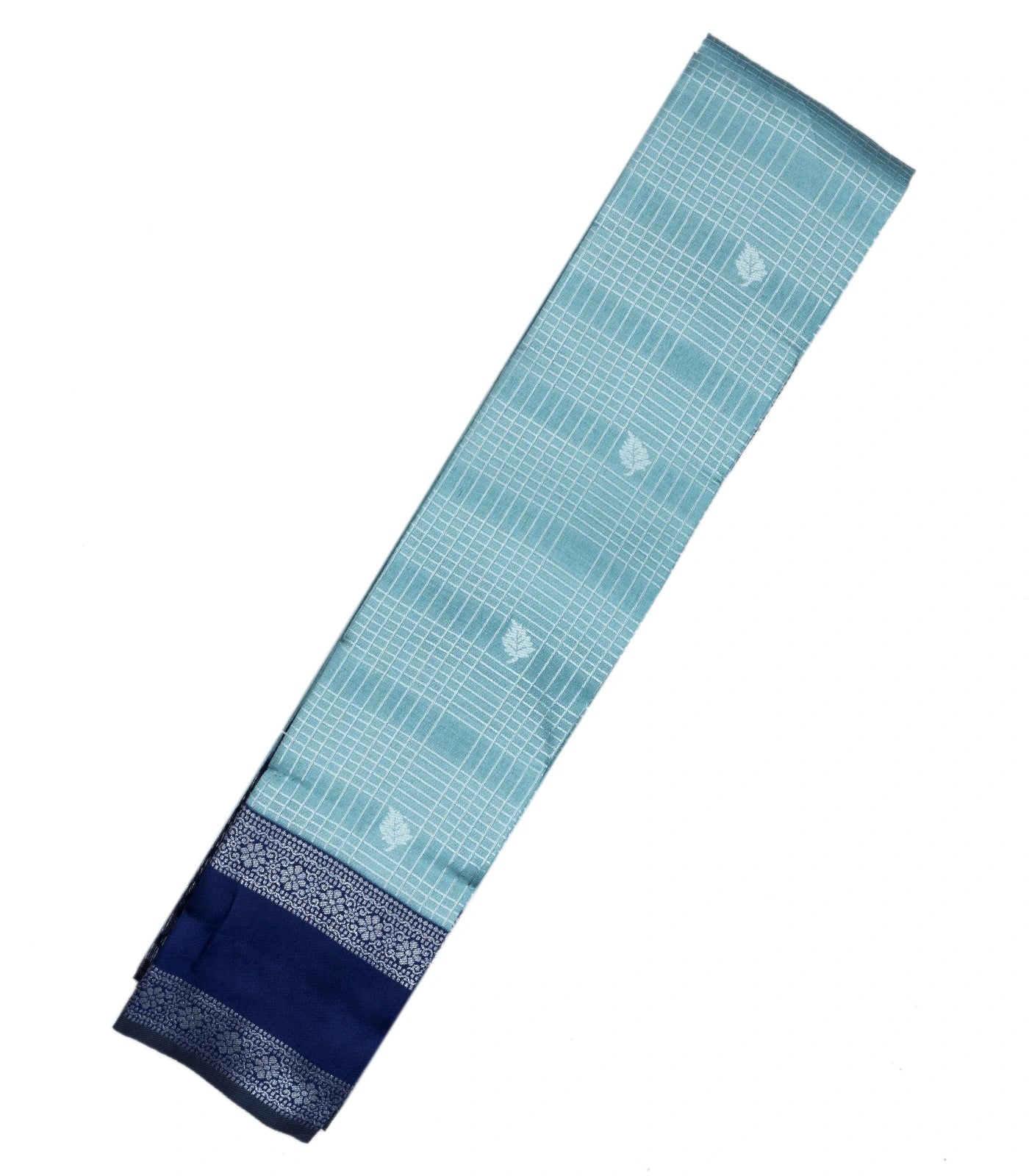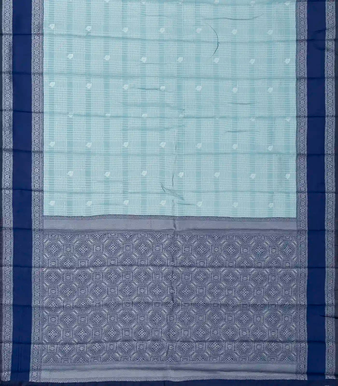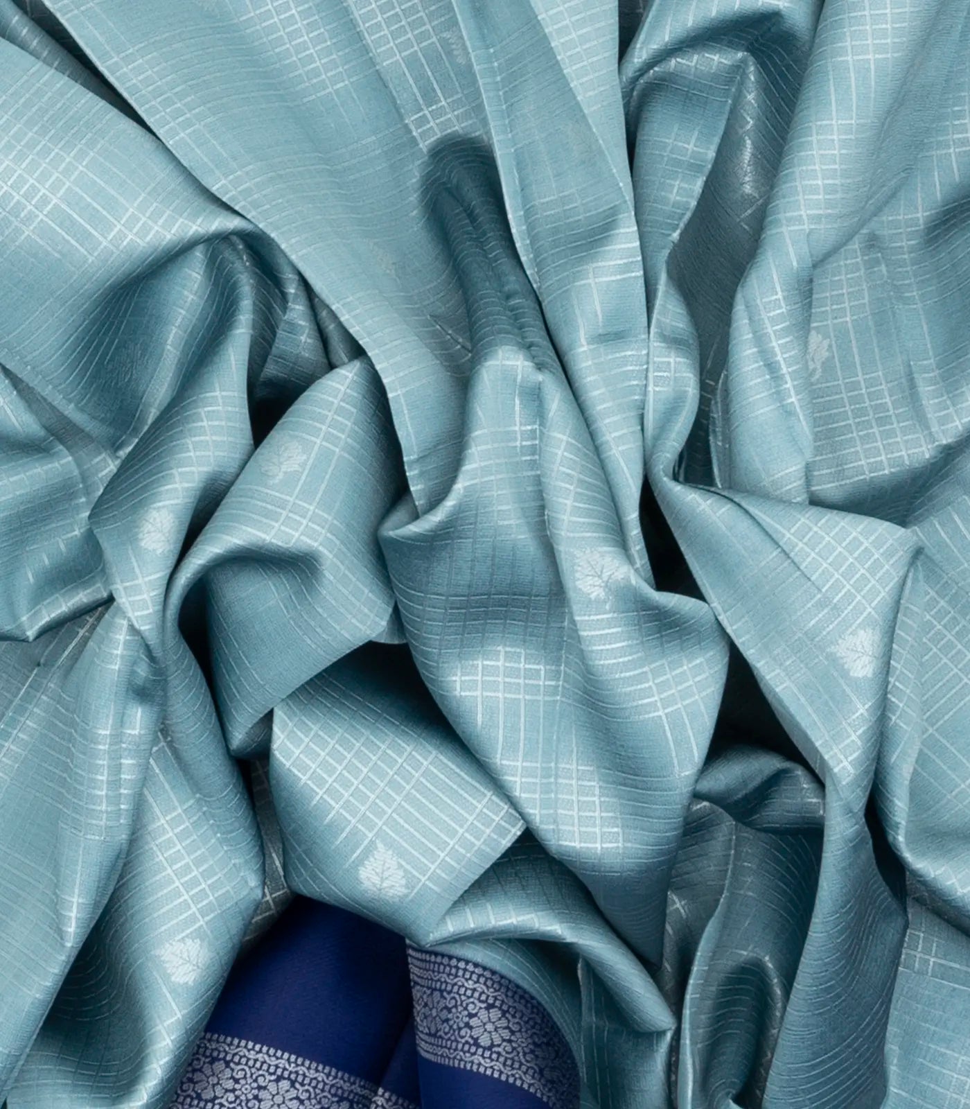 This woven art jacquard saree is filled with checks & buttas in turquoise body along with contrast navy blue border and pallu