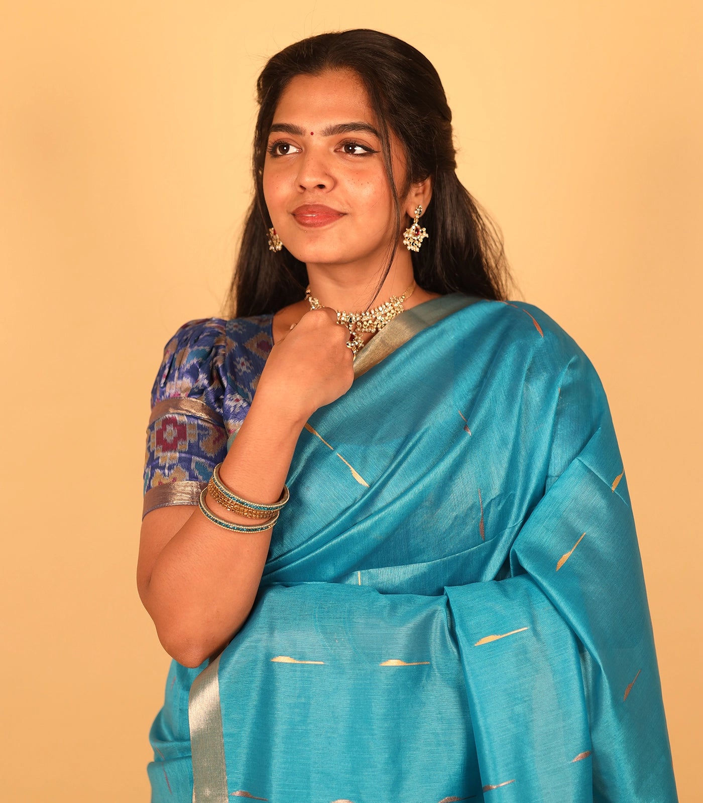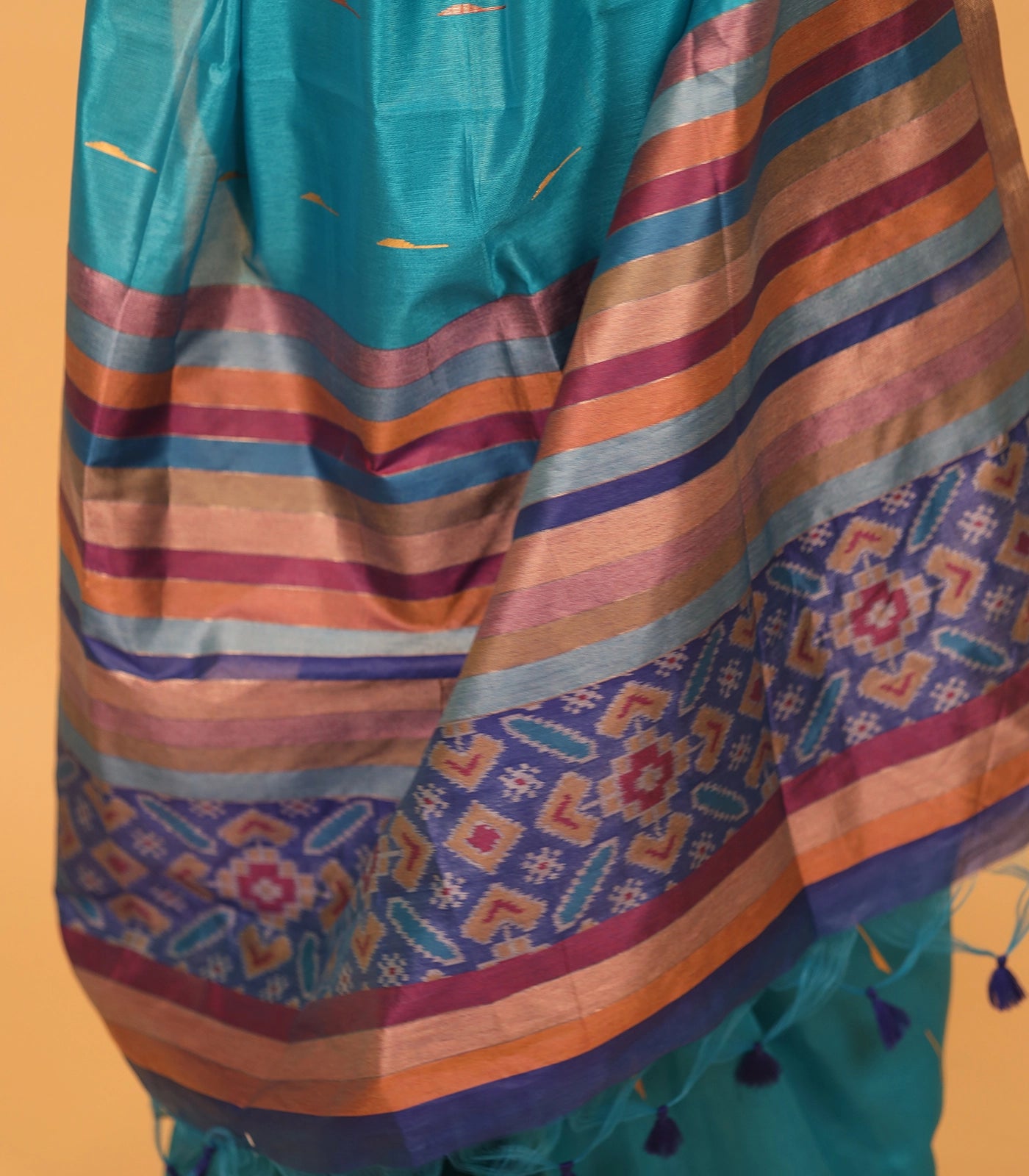 This woven art tussar silk saree with jasmine bud motifs in turquoise body along with pallu