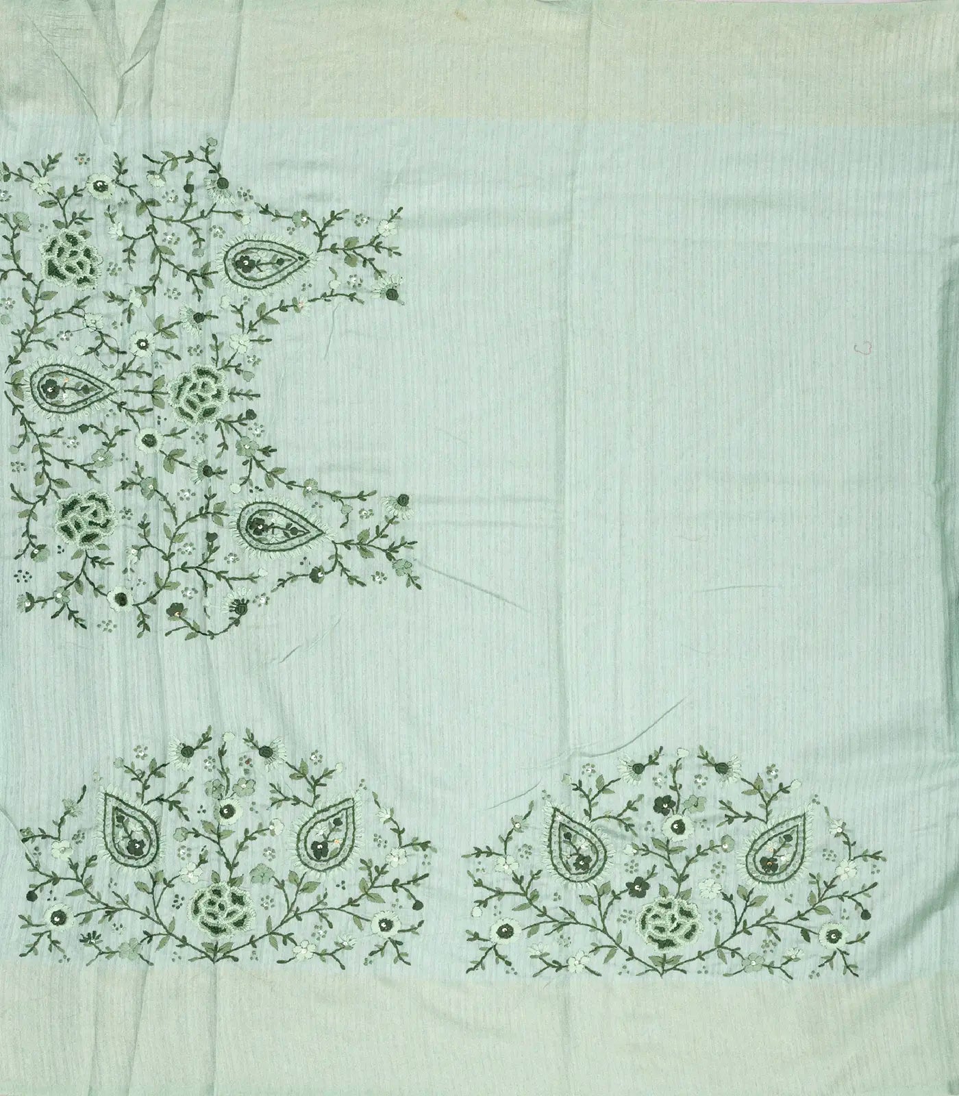 This woven blended Dupion saree is filled with embroidered floral motifs in turquoise body along with border and pallu