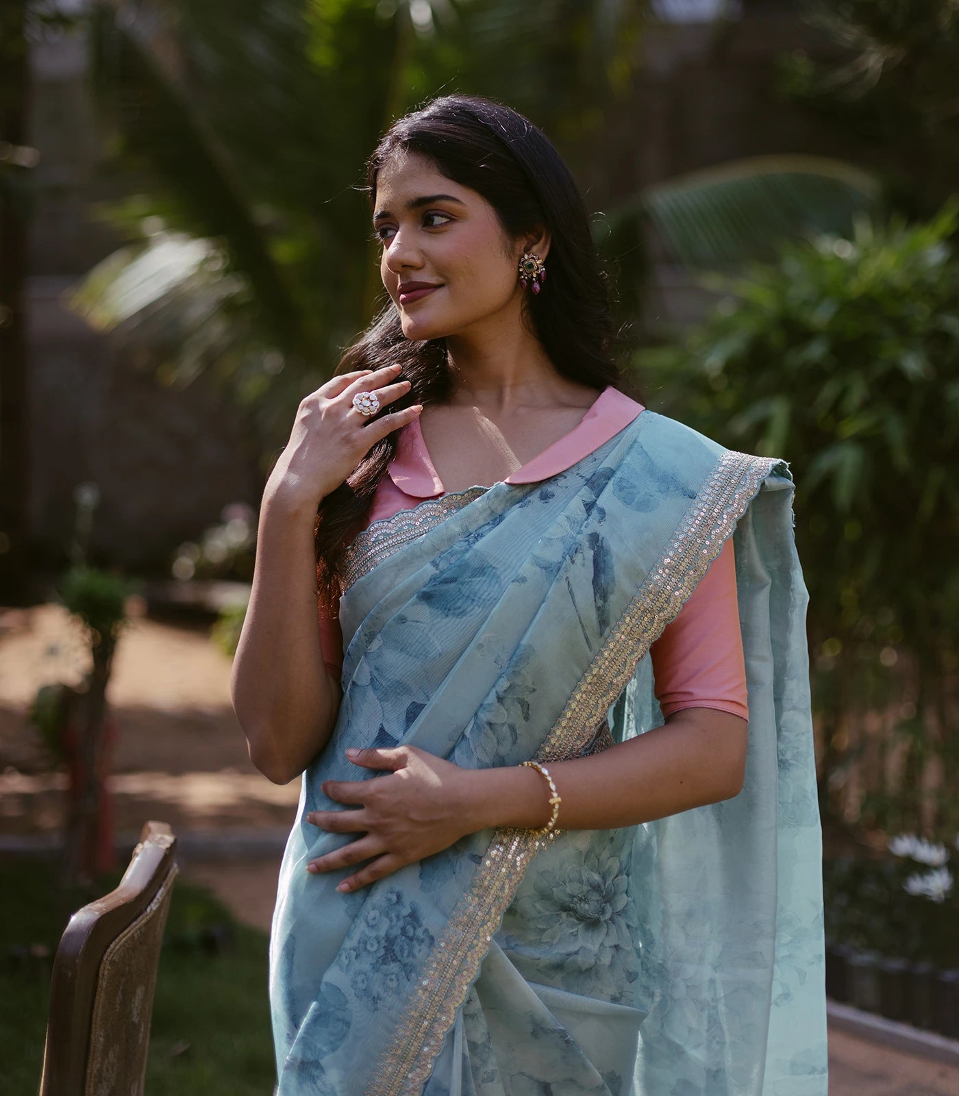 This woven organza silk saree is filled with printed motifs in turquoise body along with embroidered motifs in border and pallu