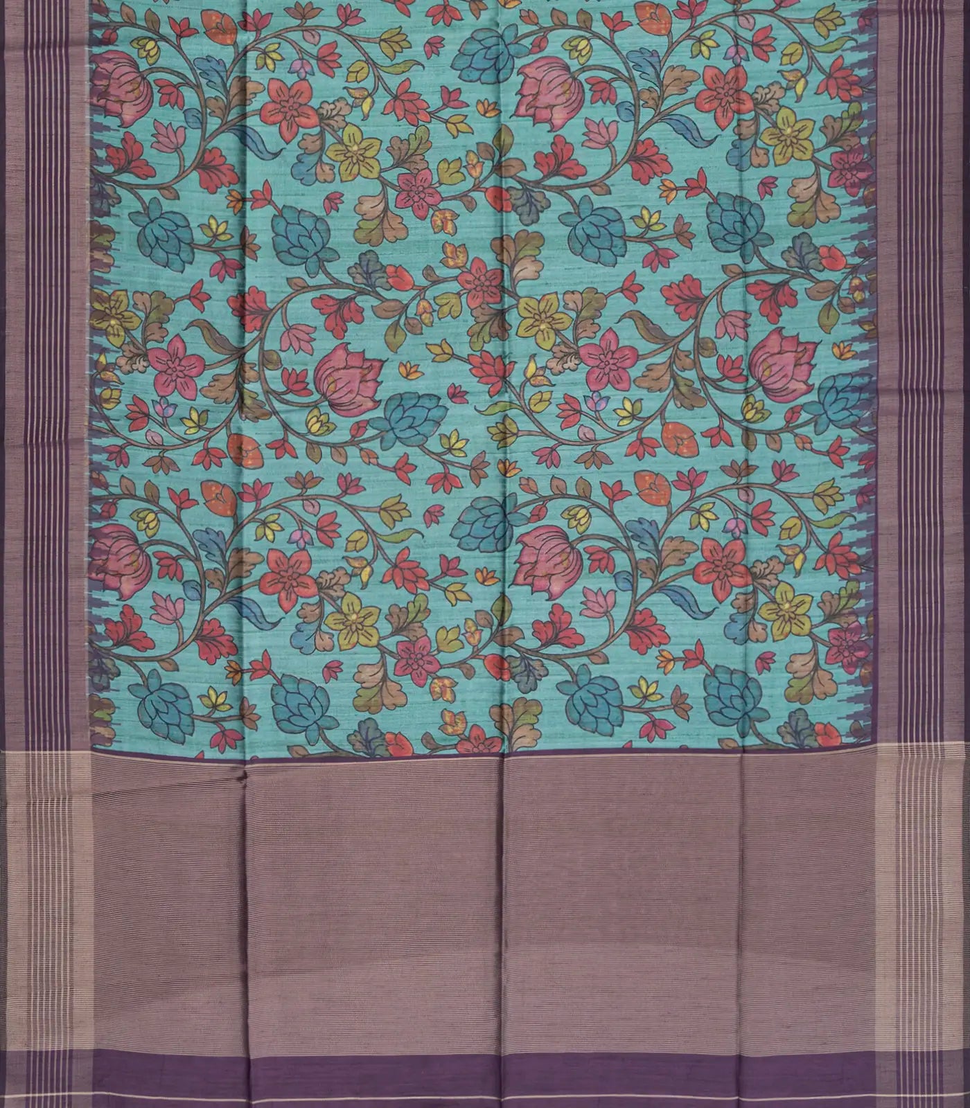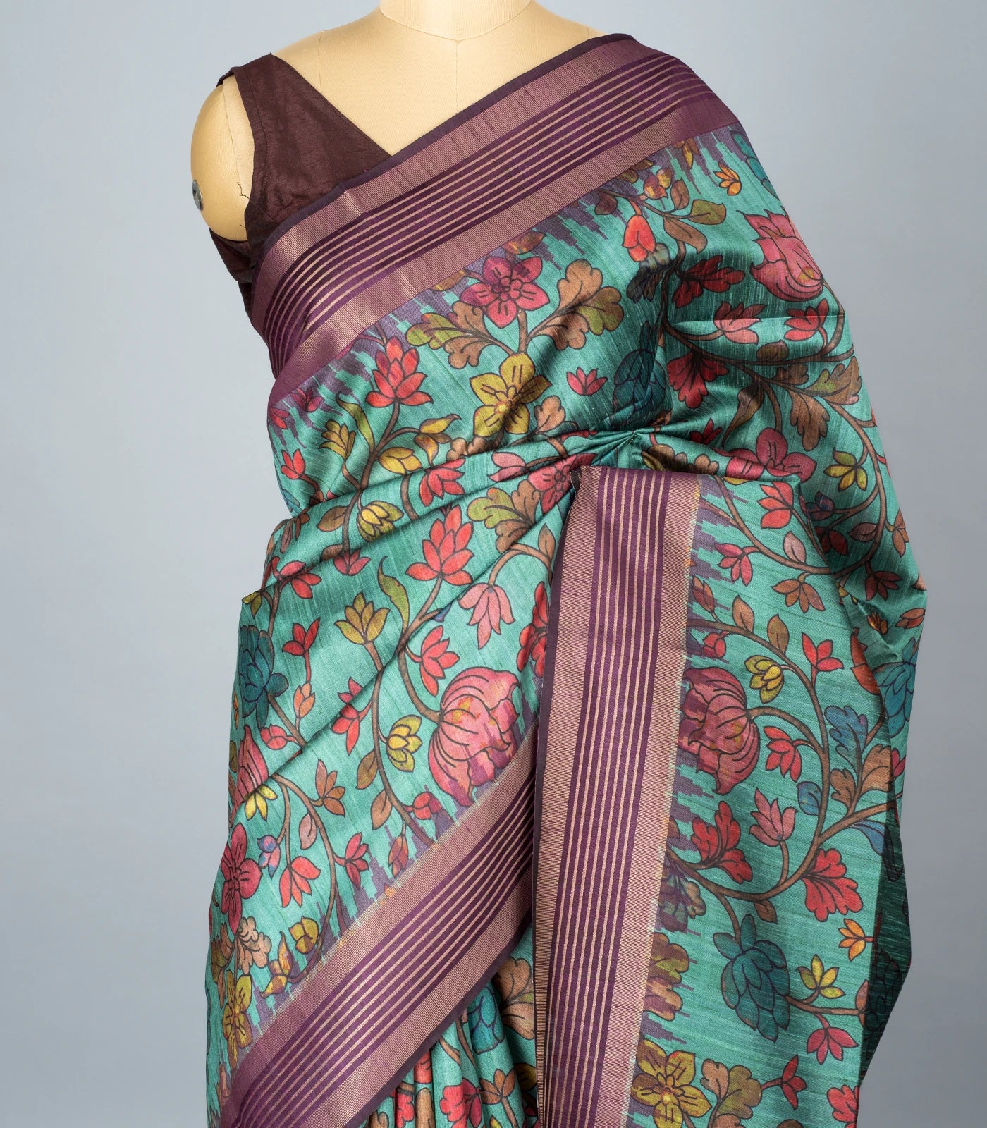 This woven synthetic dupion saree is filled with printed kalamkari motifs in turquoise body along with border and pallu