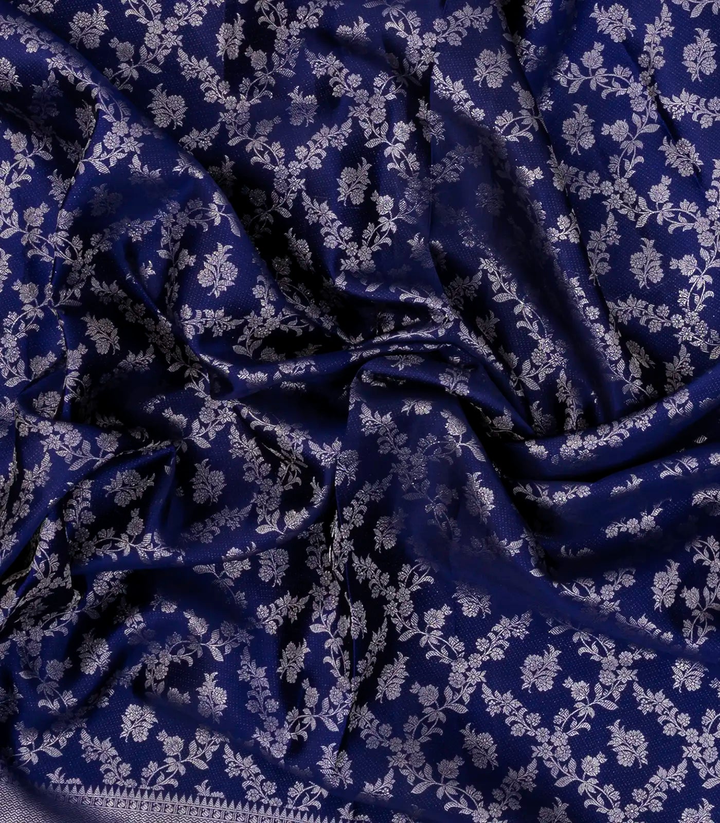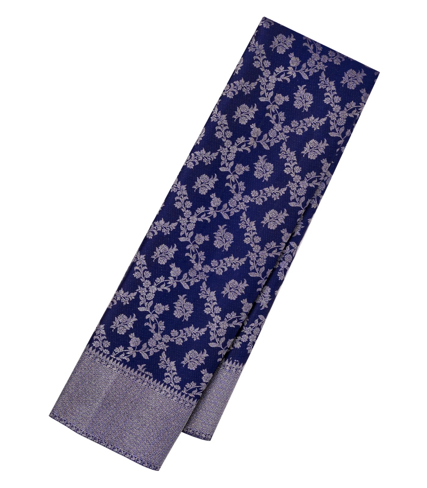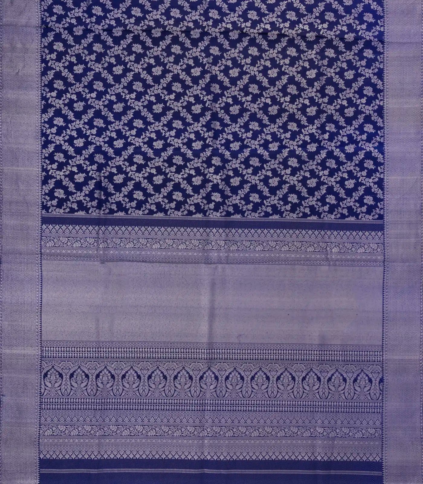 This handwoven kanchipuram silk saree is filled with floral jaal motifs in violet body along with zari border and pallu