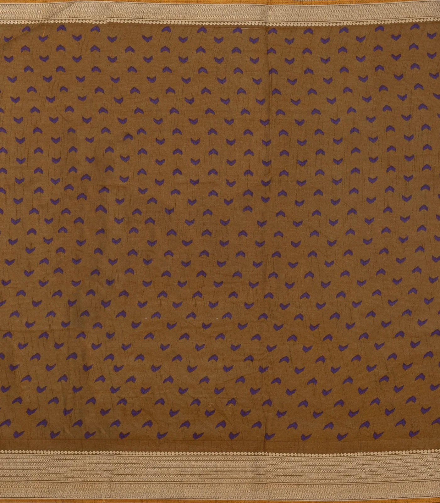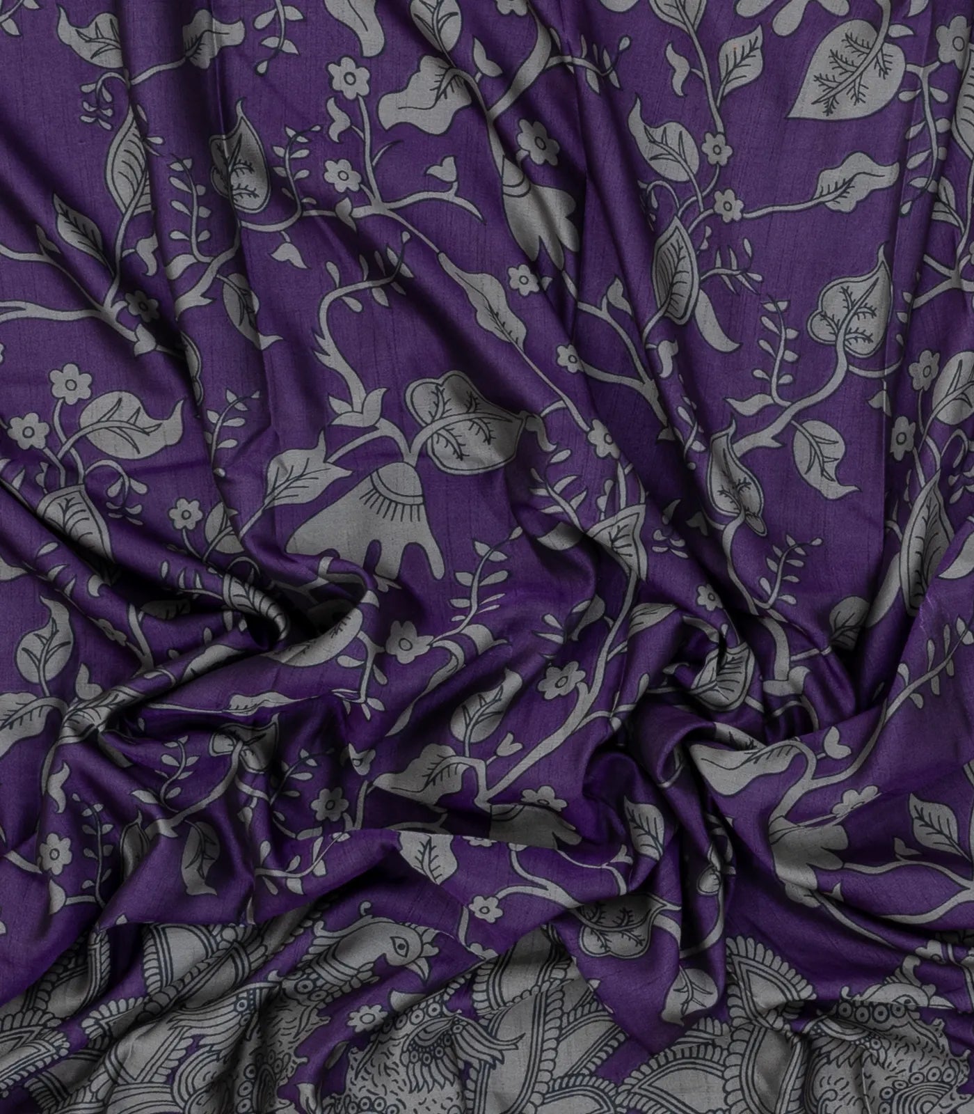 This woven art tussar saree is filled with printed motifs in violet body along with contrast border and pallu