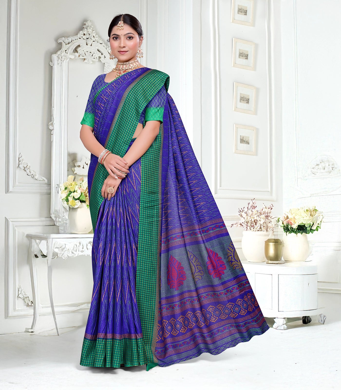 This woven synthetic crackle saree is filled with printed motifs in violet body along with border and pallu