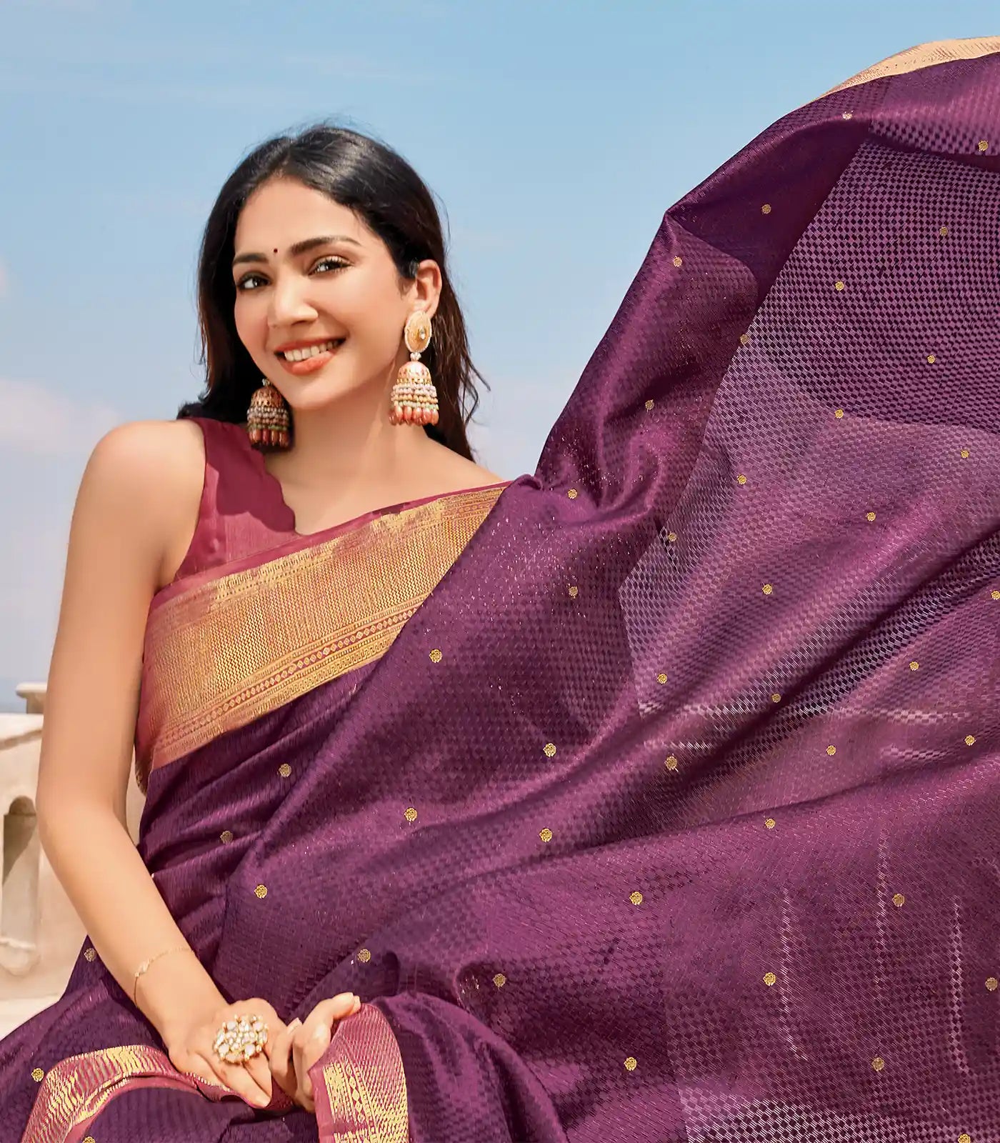 RmKV Design Studio presents the quintessential handwoven silk saree, a timeless masterpiece that embodies the allure of Pantone Color of the Year “Viva Magenta.” Crafted with natural dyes like indigo and lac, this saree redefines comfort with its lightweight construction, 40% less than traditional silks weaved using patented lino weaving. The classic basket weave pattern of Payadi checks is elevated with the sophistication of gold coin motif butties. The border, adorned with traditional Kanchipuram motifs in golden zari, seamlessly blends heritage with contemporary, making this saree a testament to the enduring artistry of weavers.