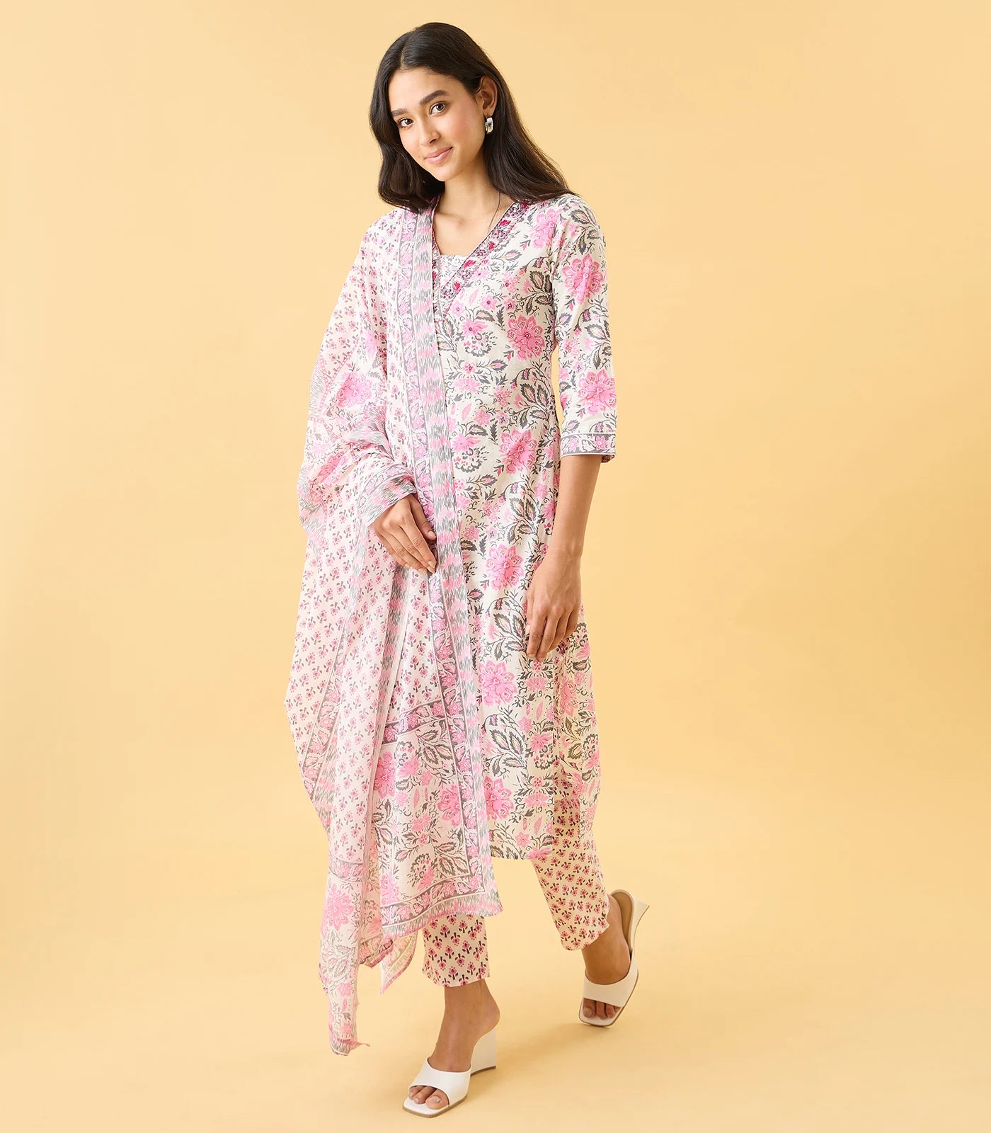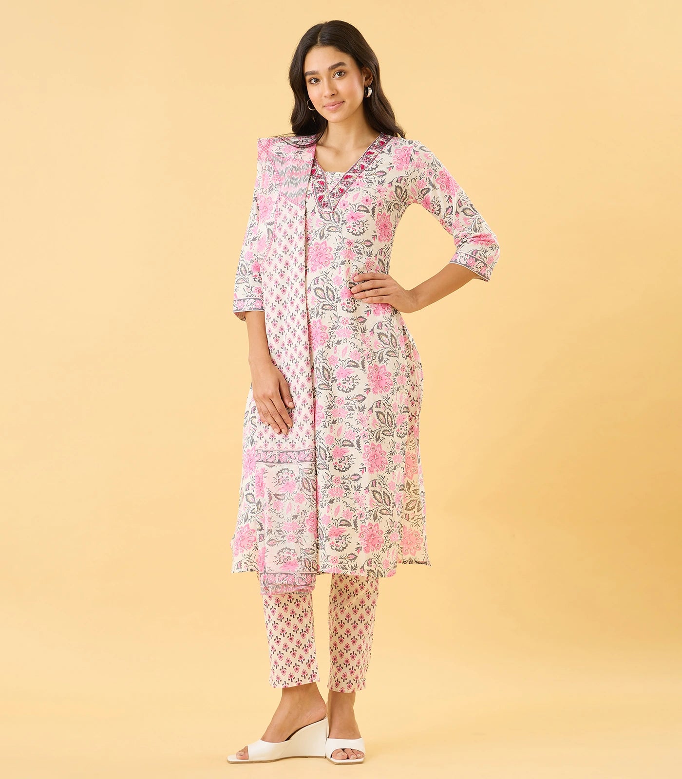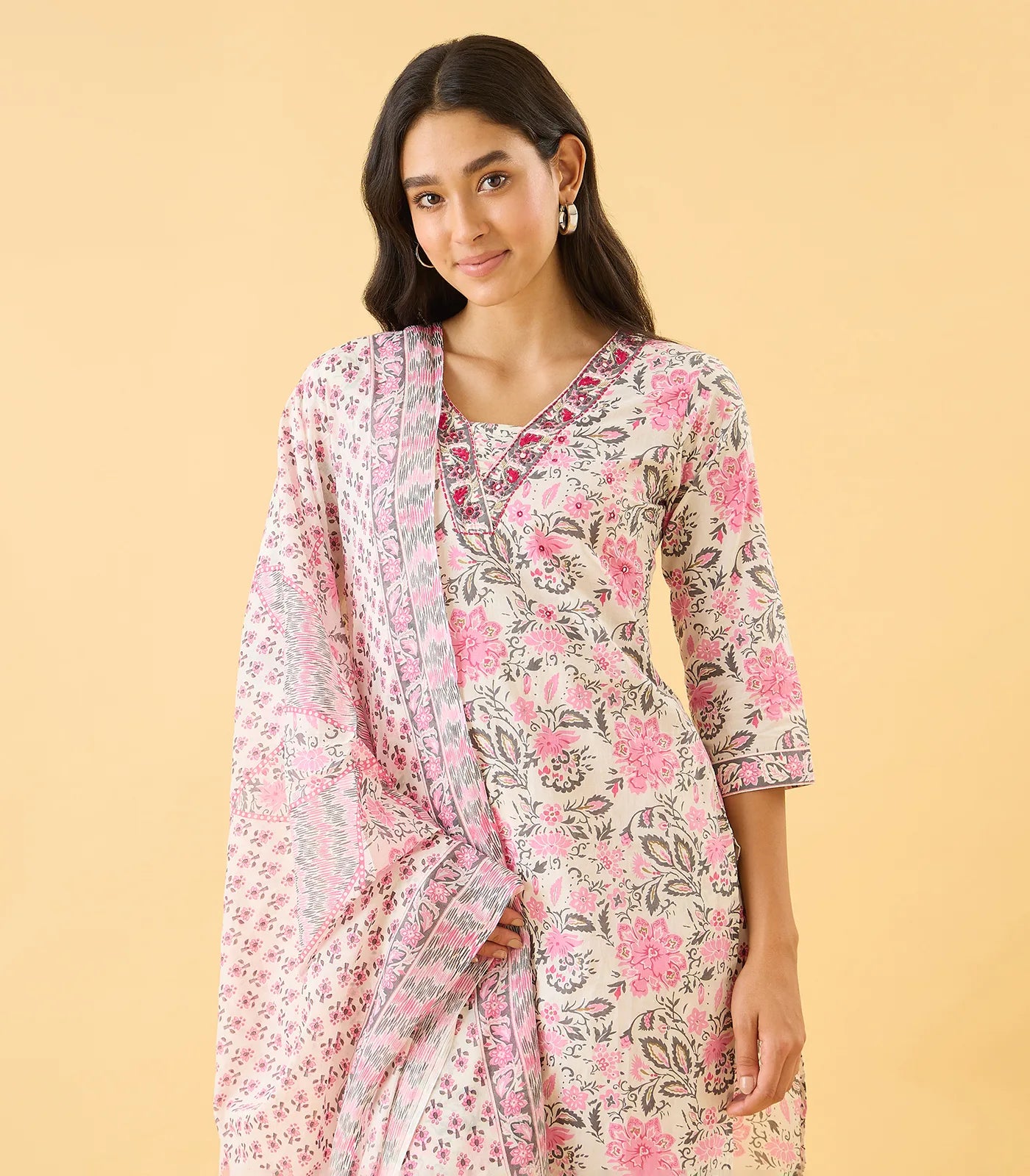 Stylized neckline with floral embroidery detailing and highlight thread work detailing at center front.