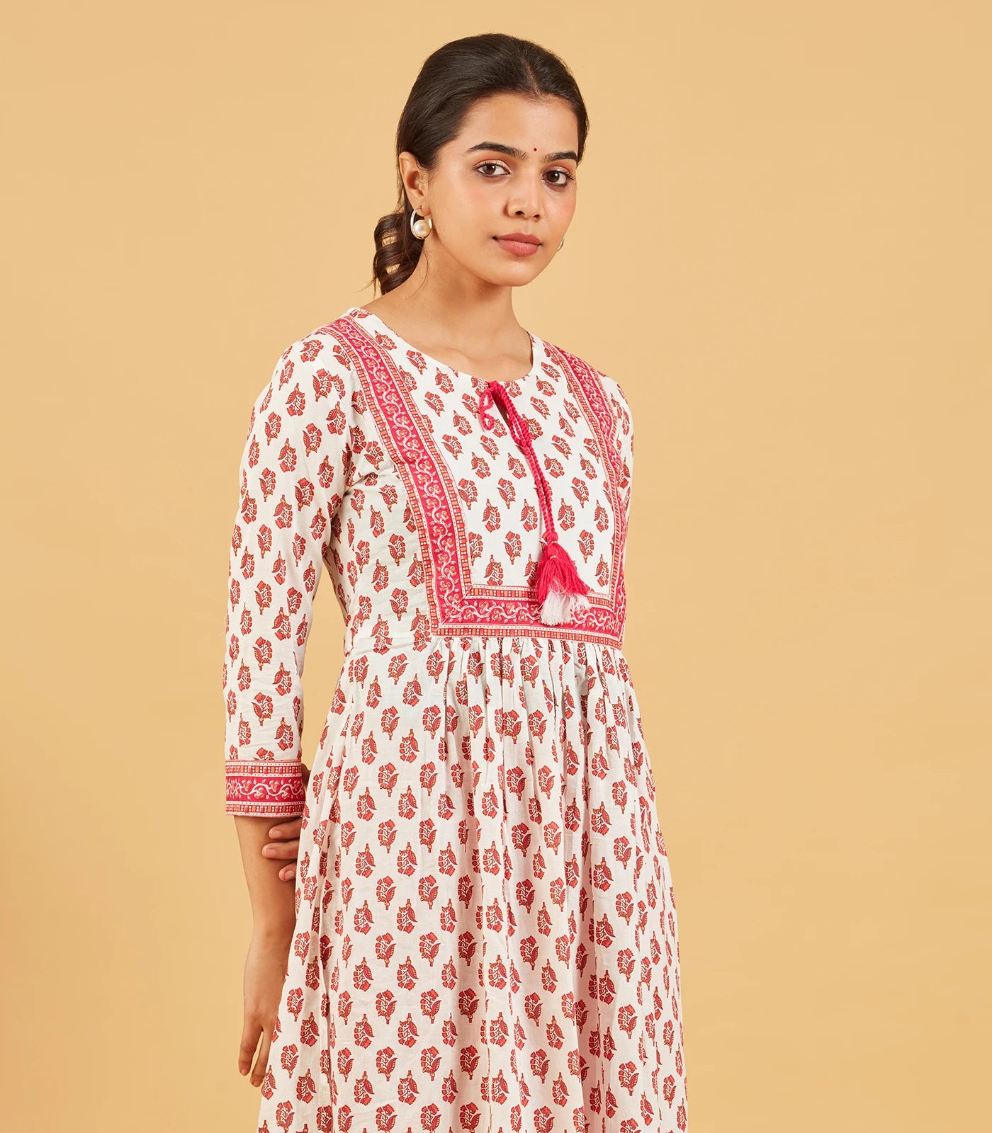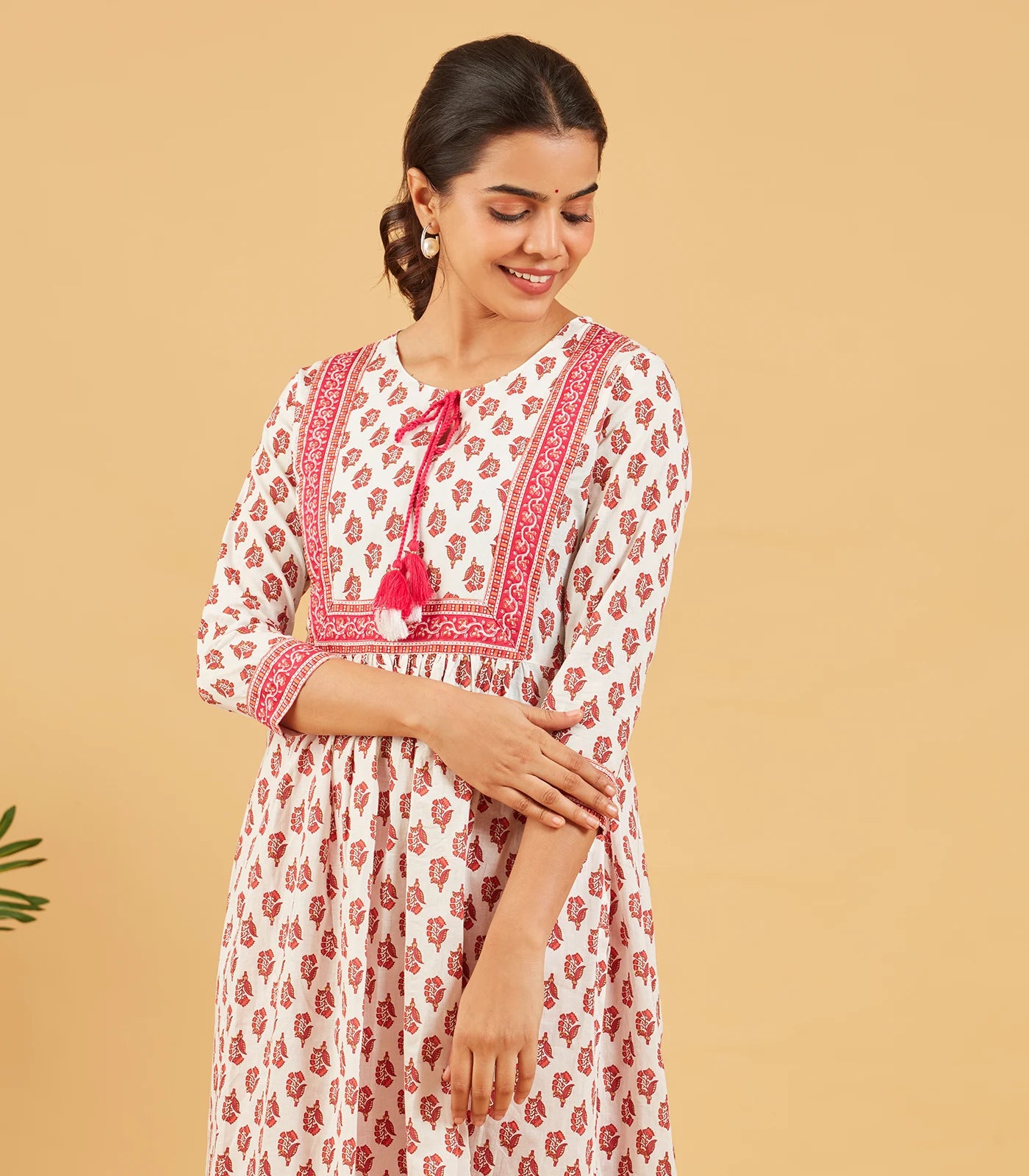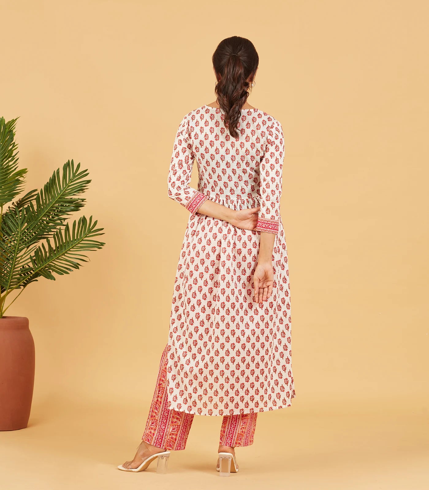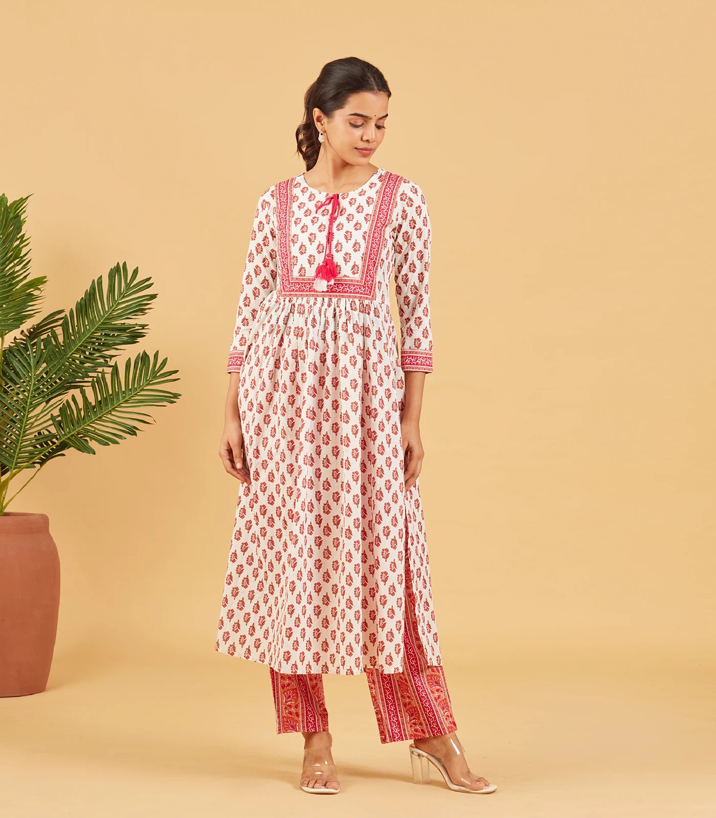 A Striking Blend Of Elegance And Vibrancy, The Red Kurta Set Is A Captivating Choice. It Has Intricate Floral Motifs All-Over, Exudes A Regal Charm. It Comes With A Matching Printed Palazzo Pants For A Sophisticated Look. The Kurta Features A Variety Classic U-Neckline,¾ Length Sleeve, Catering To Diverse Tastes. This Captivating Ensemble Is Perfect For Casual Go-To Outfit Or Even Formal Events, Ensuring You Make A Memorable Impression