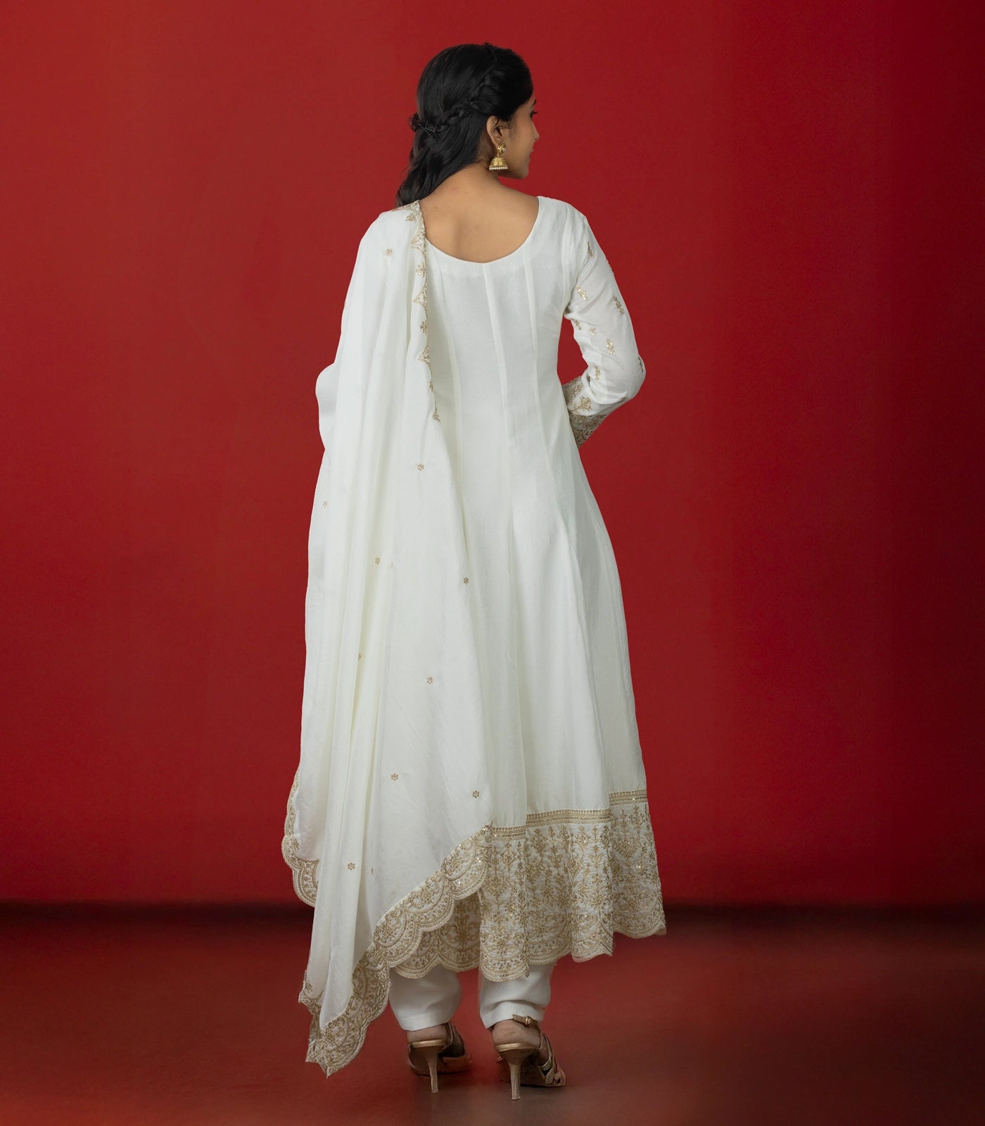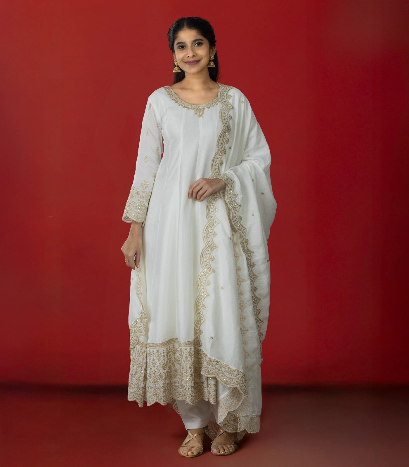 ● Round neckline with intricate embroidery detailing at the centre front ● Long sleeves with embroidery detailing ● Paired with matching straight fit trousers and embroidered dupatta