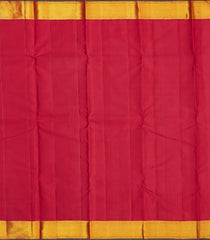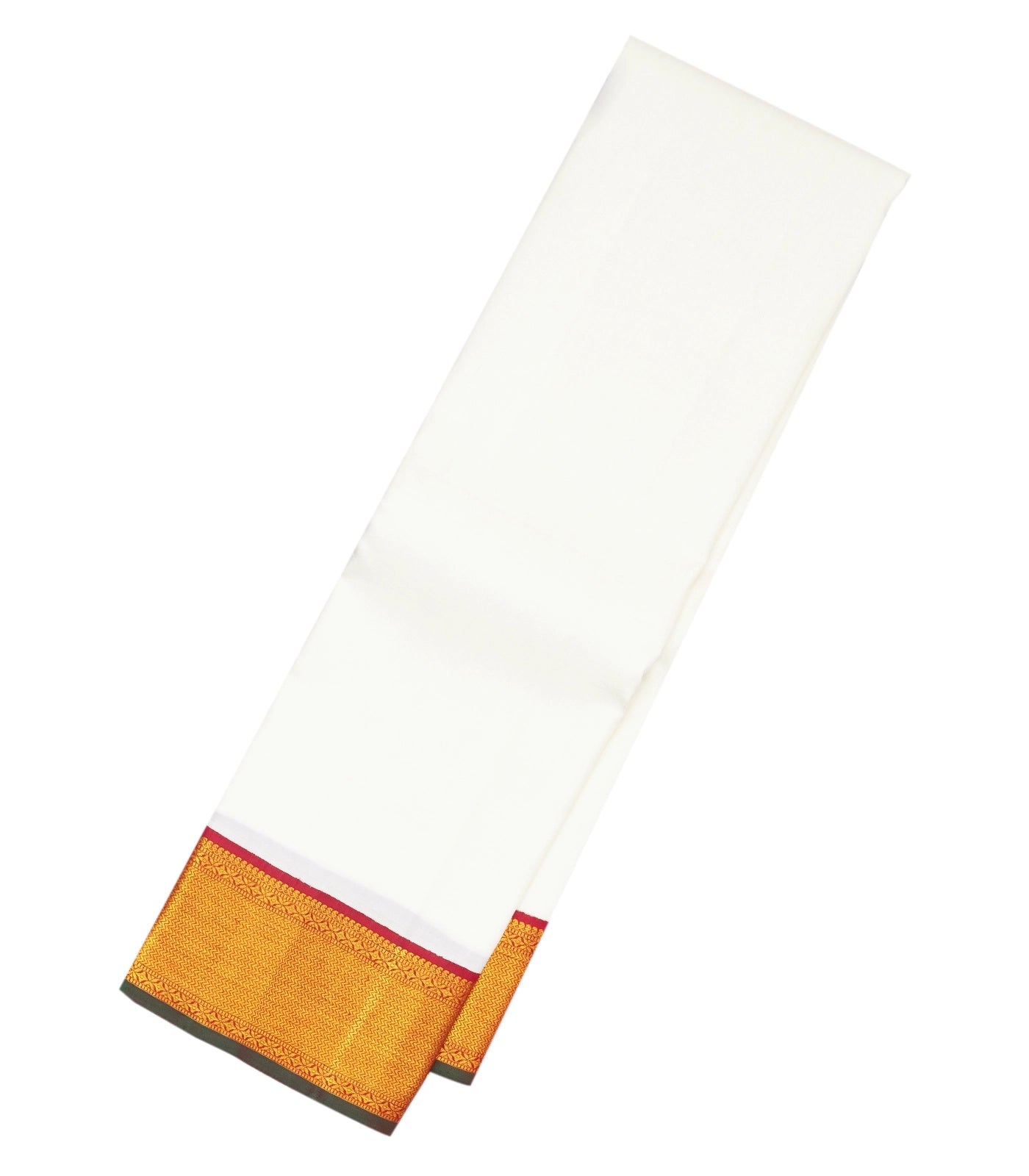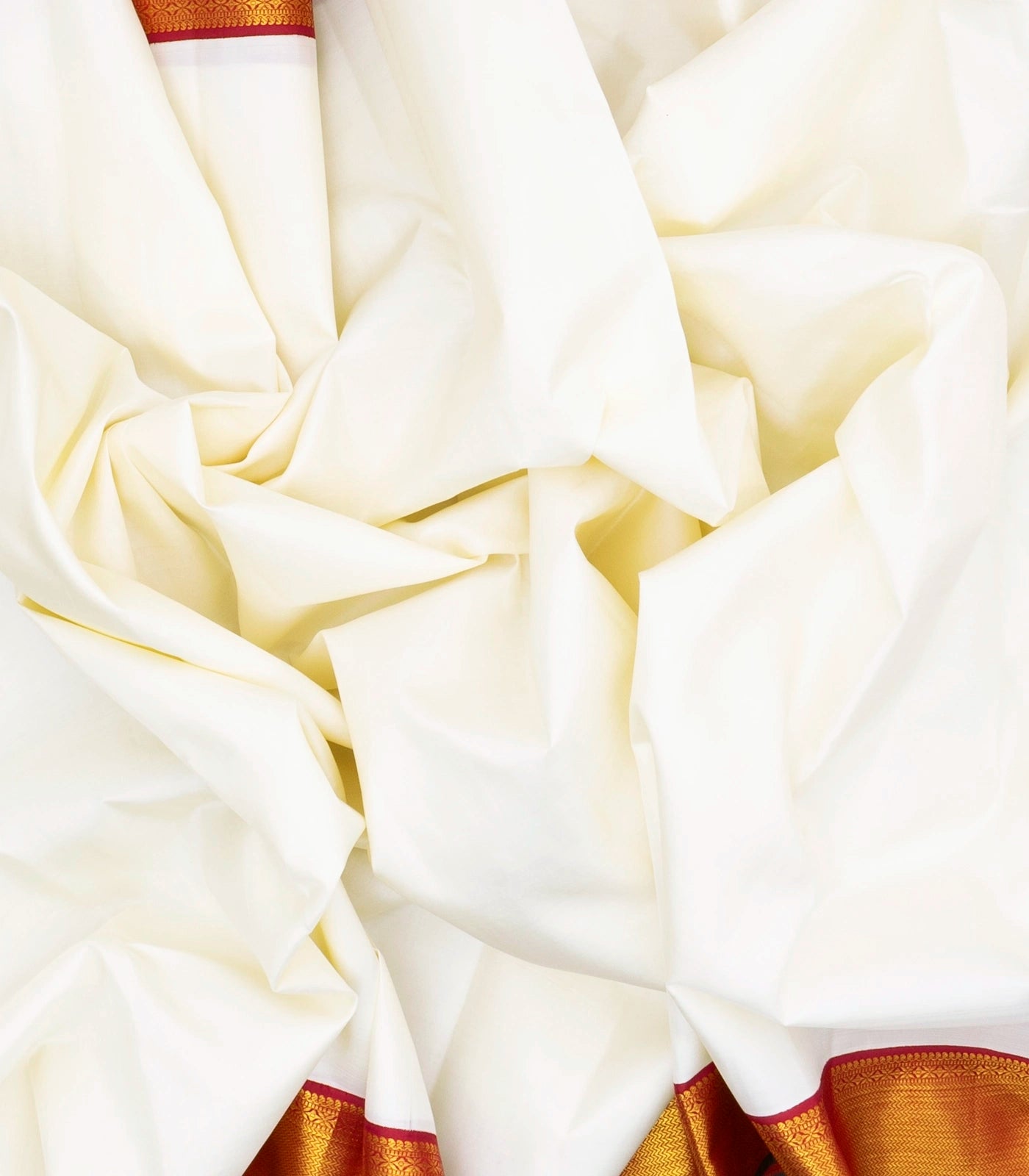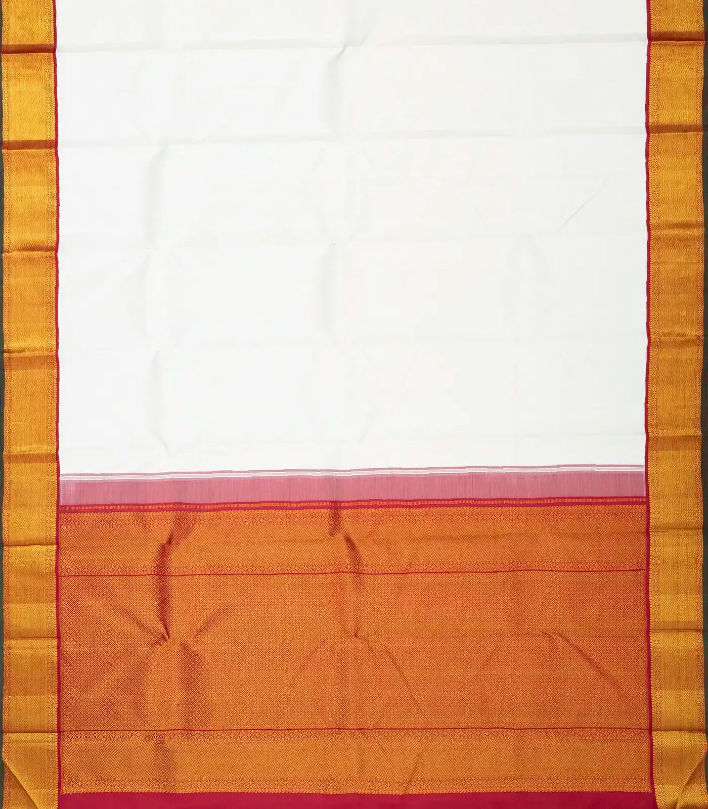 This handwoven korvai kanchipuram silk saree is filled with plain white body along with contrast crimson border and pallu