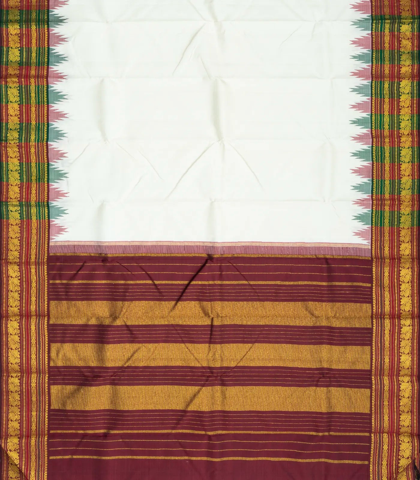 This handwoven korvai kanchipuram silk saree is filled with plain white body along with contrast Thazampoo rekku border and pallu