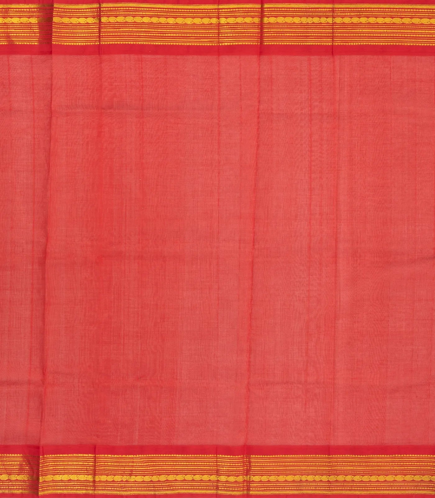 This handwoven korvai silk cotton saree is filled with plain white body along with contrast red border and pallu