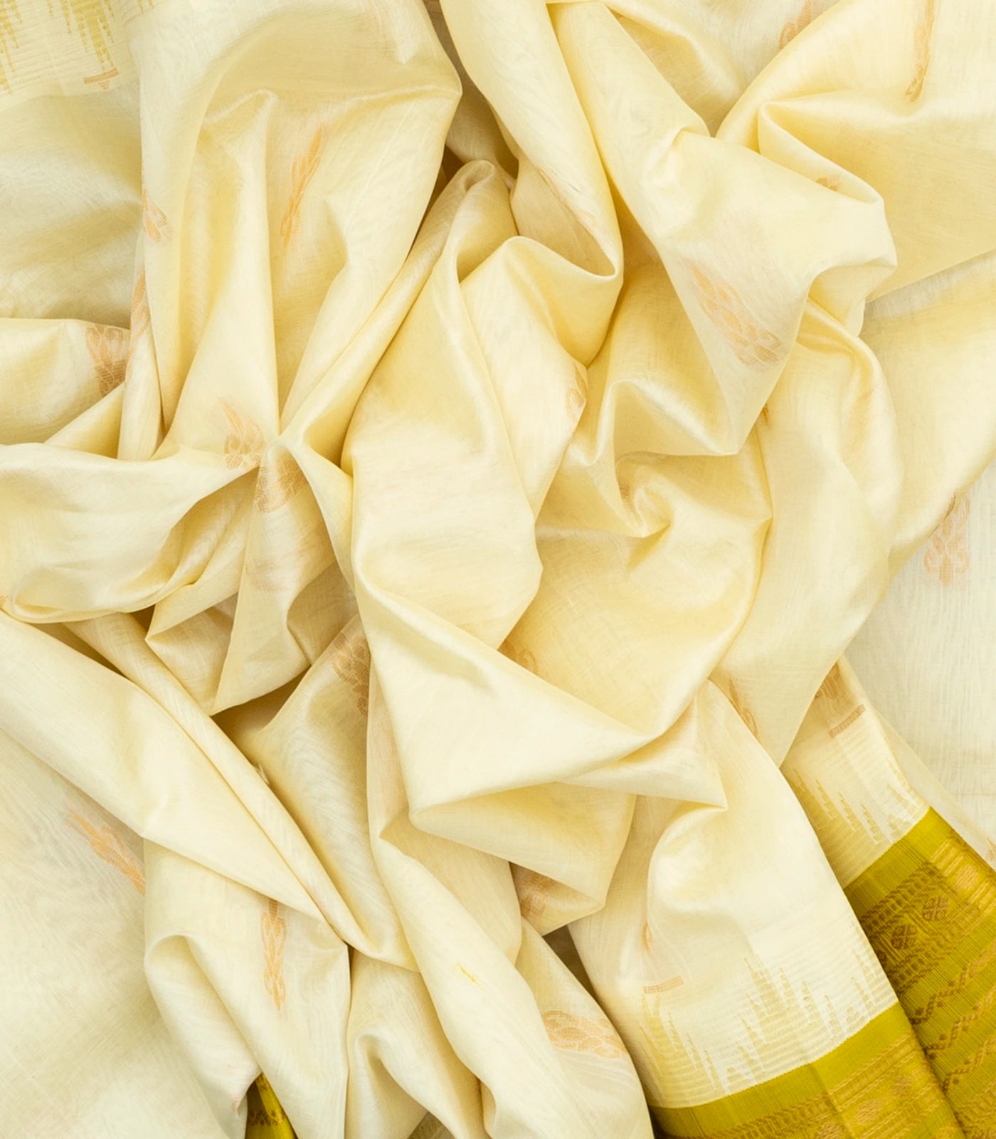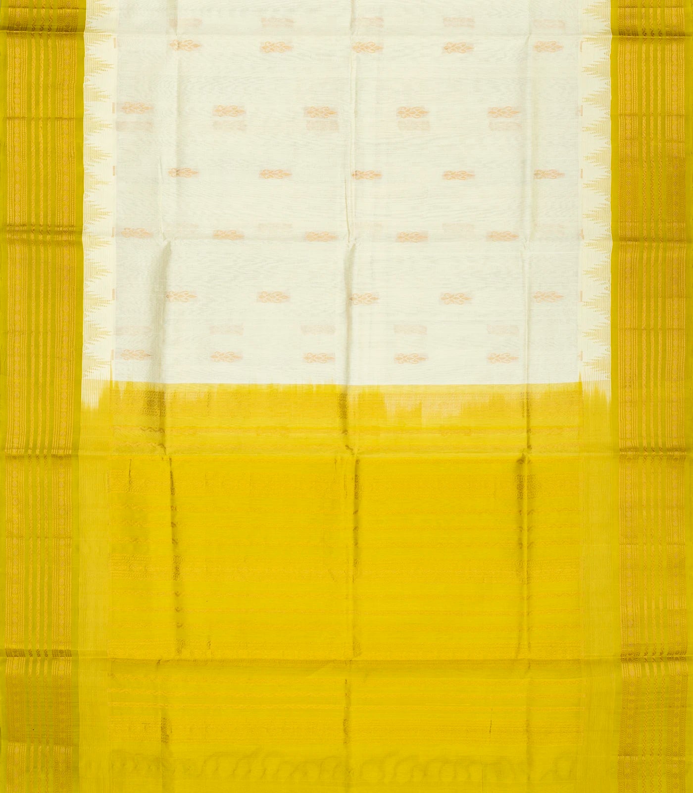 This handwoven korvai silk cotton saree is filled with floral buttas in white body along with contrast border and pallu