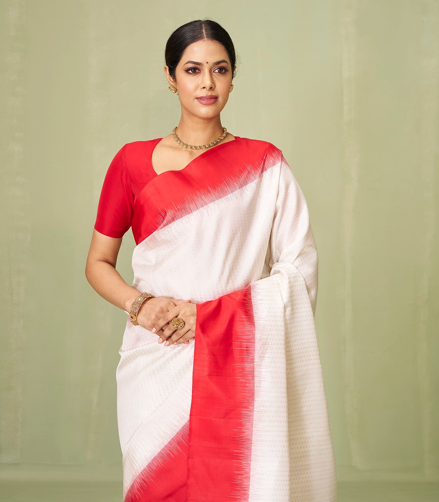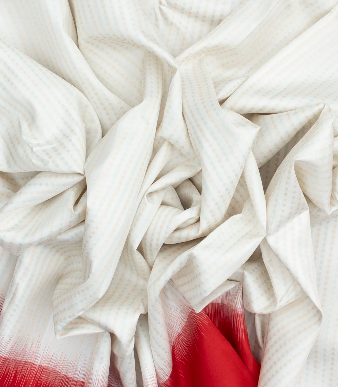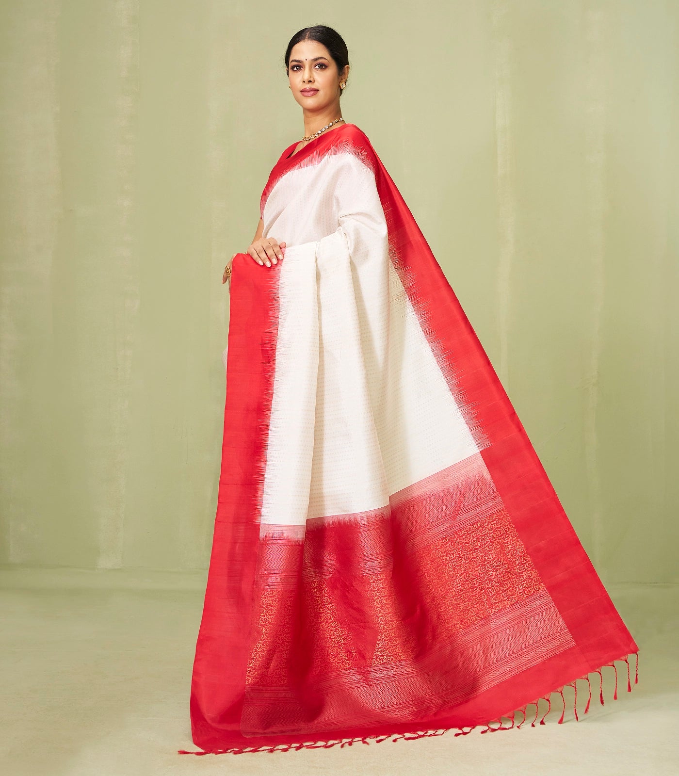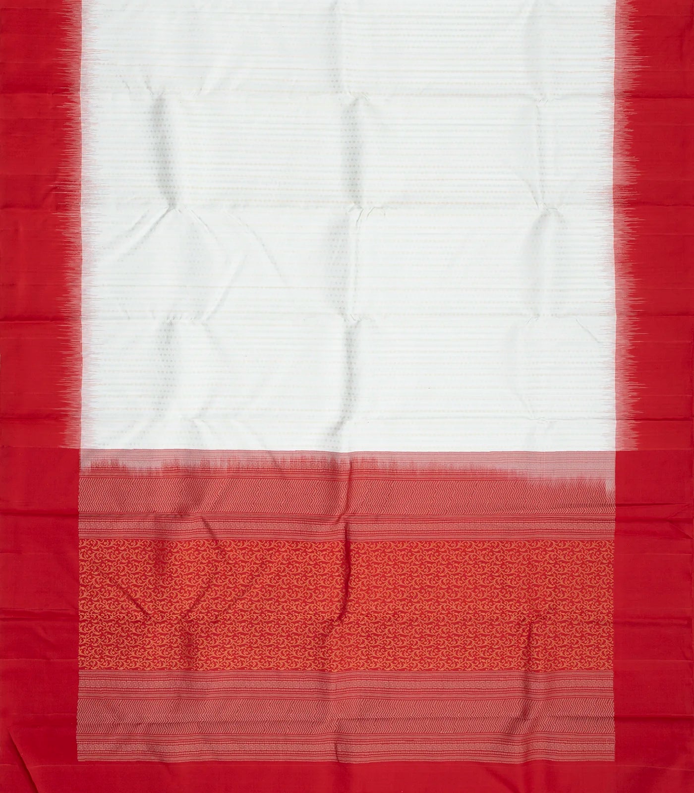 This handwoven soft silks saree is filled with floral motifs in white body along with contrast red border and pallu