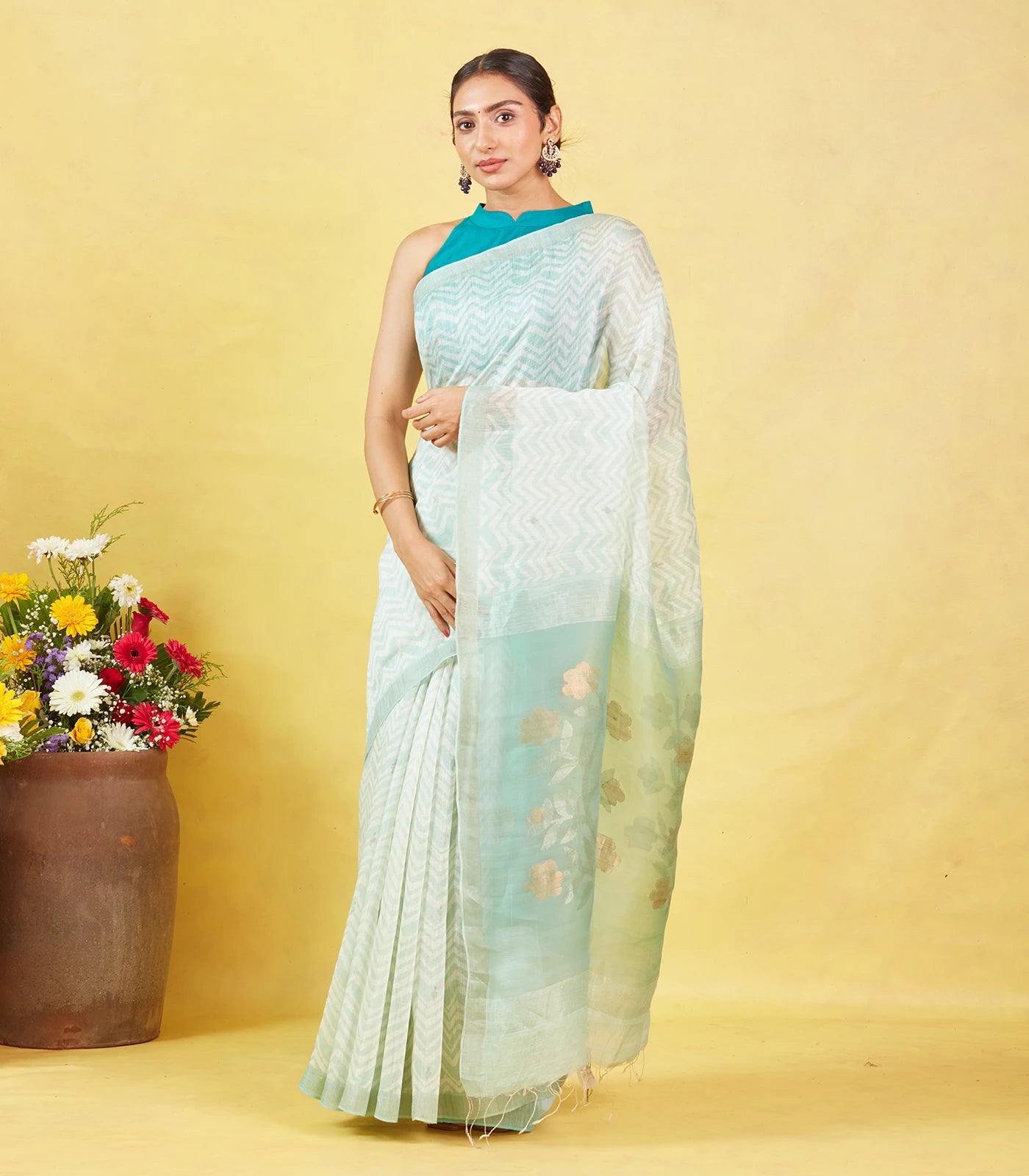 White Handloom Tussar Silk Saree With Chevron Motifs
