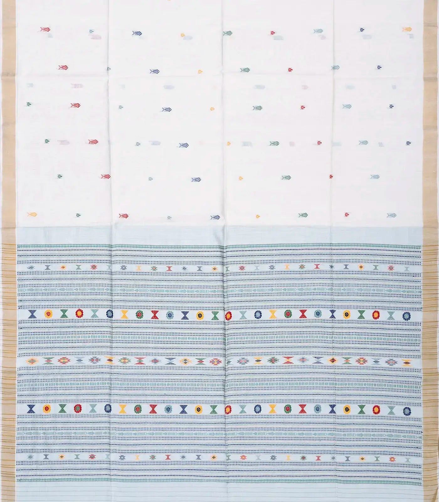 This handwoven tussar silk saree is filled with meena fish buttas in white body along with border and meena motifs in pallu