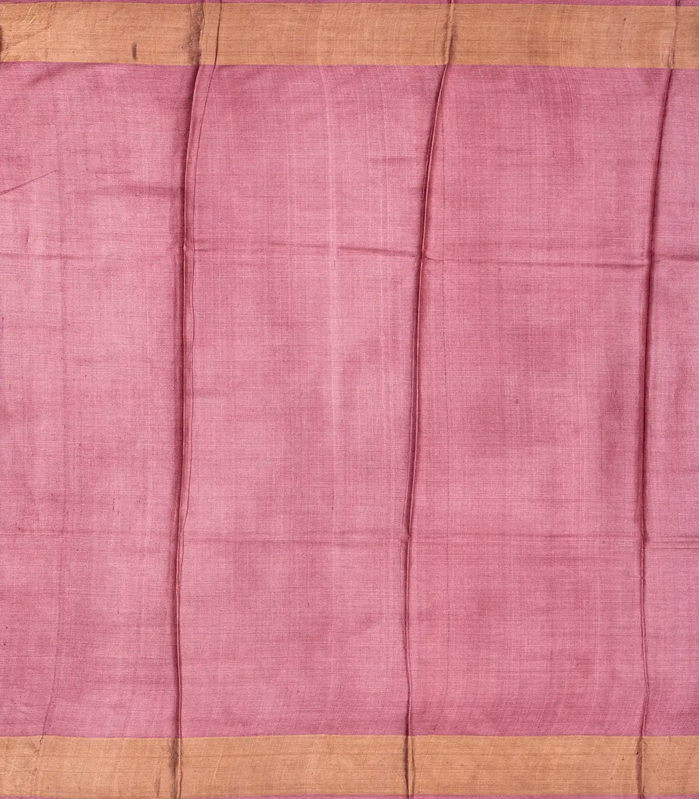This handwoven tussar silk saree is printed with vine motifs in white body along with contrast border and pallu