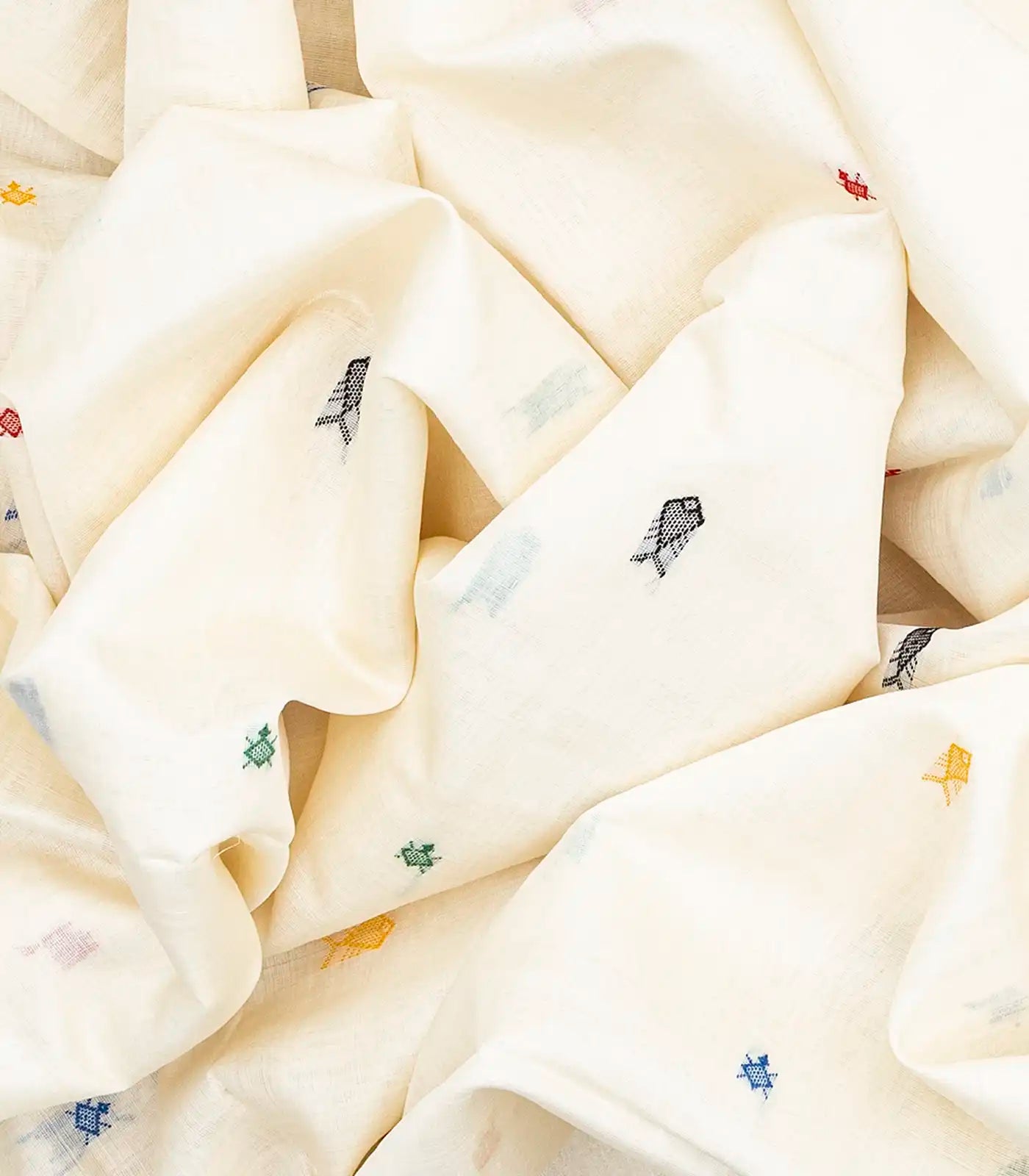 White Handwoven Tussar Silk Saree With Meena Fish Motifs-White