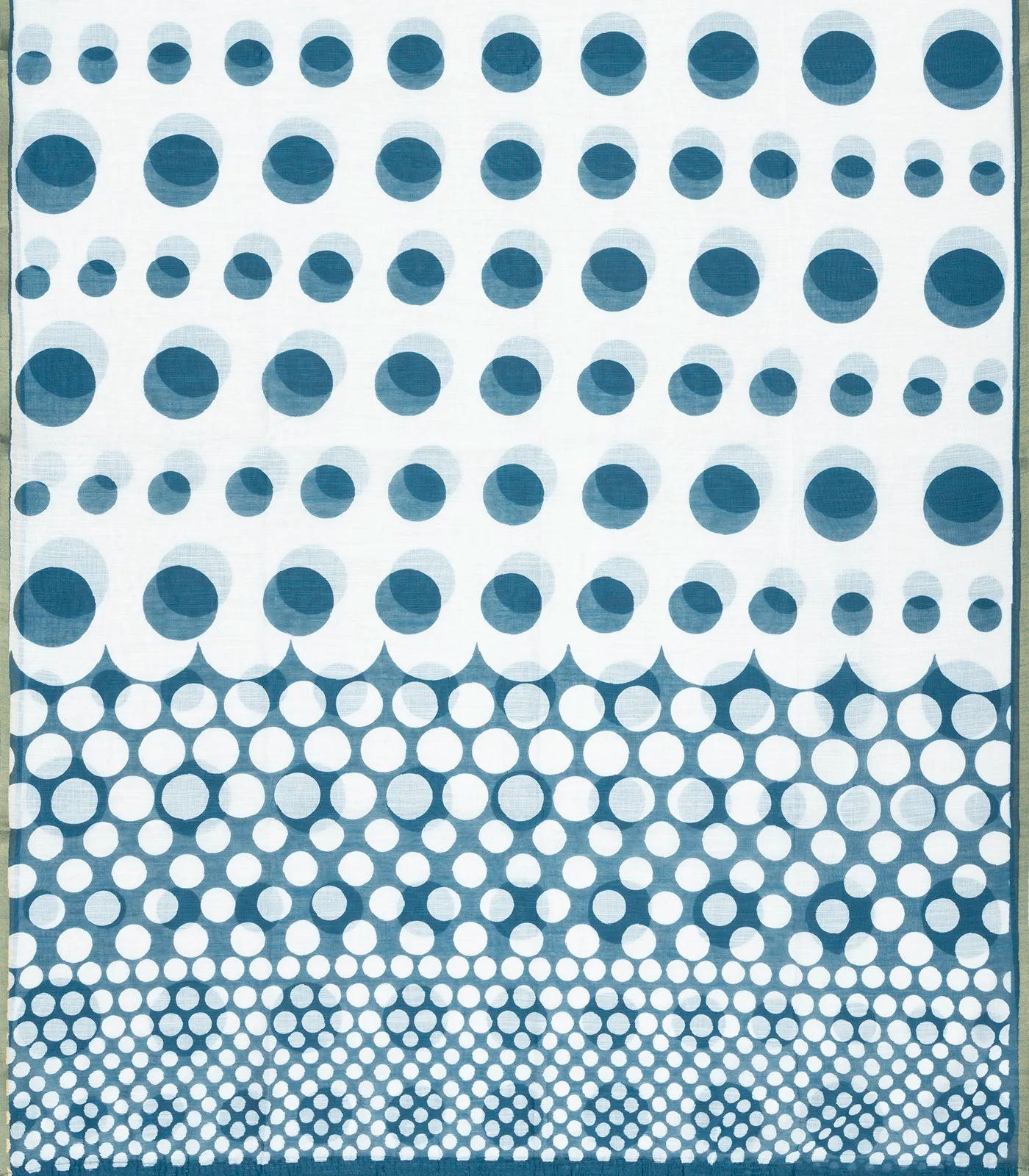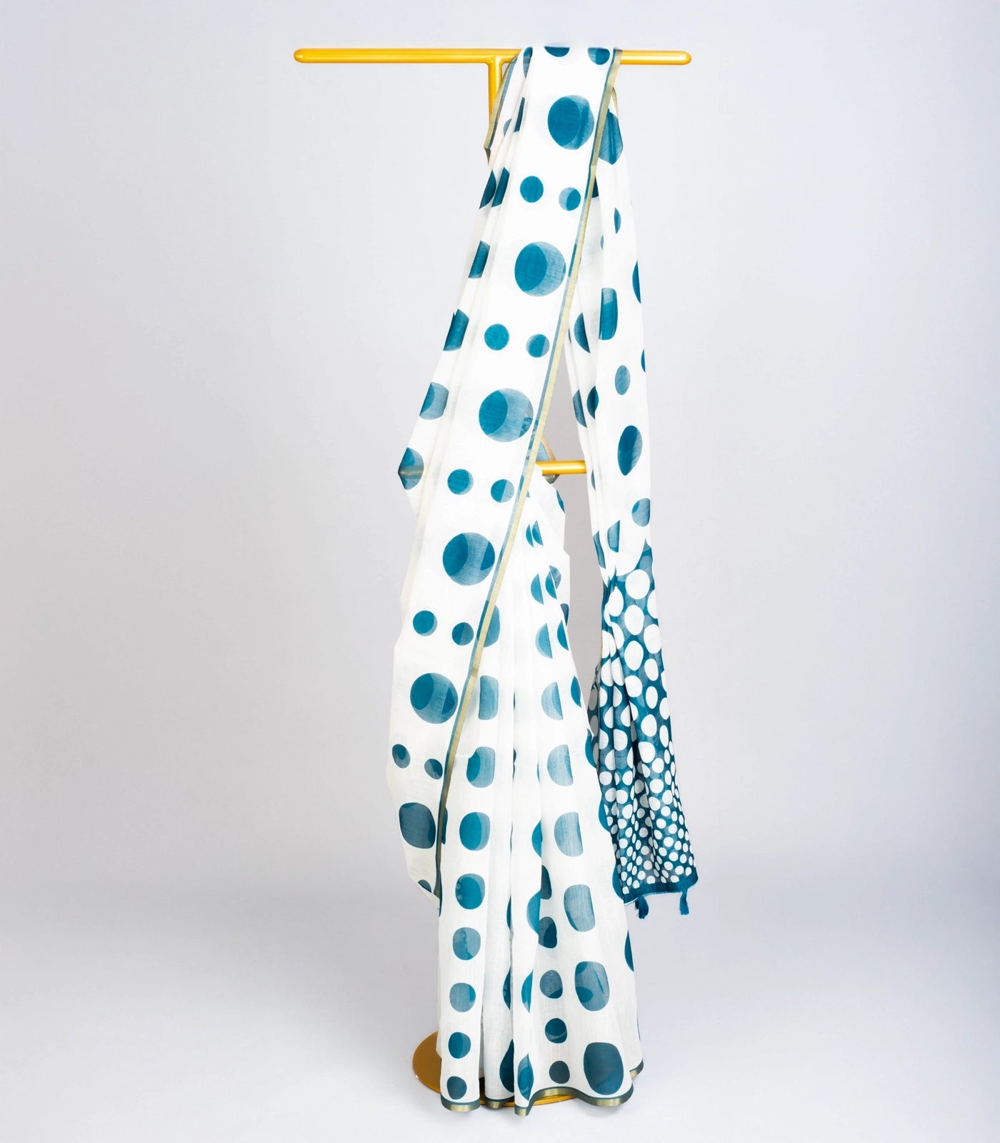 This woven art linen saree is printed with polka dots in white body along with pallu