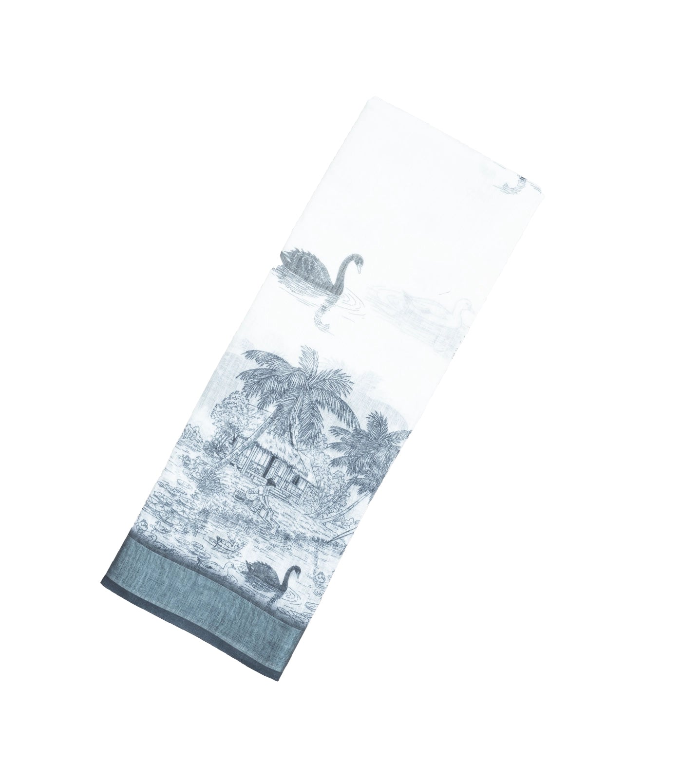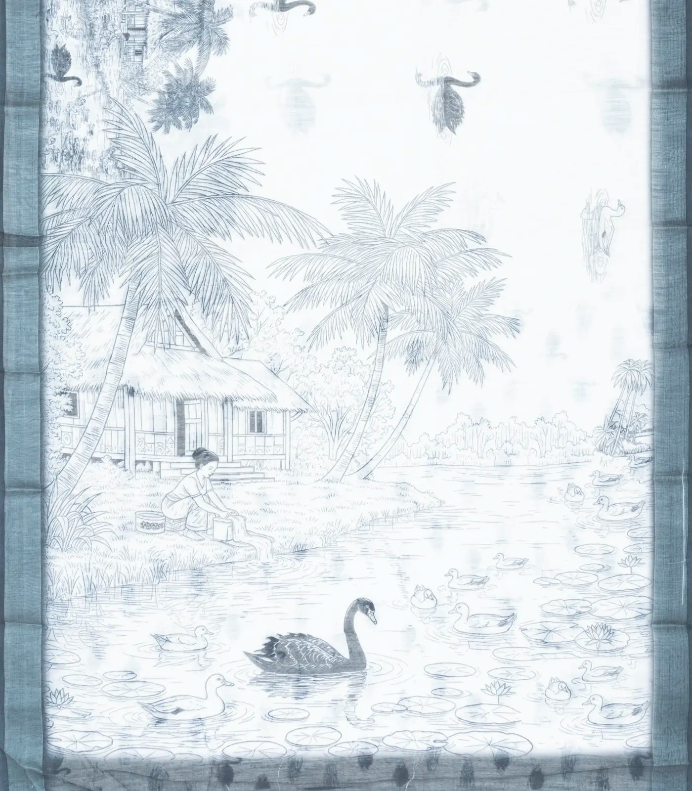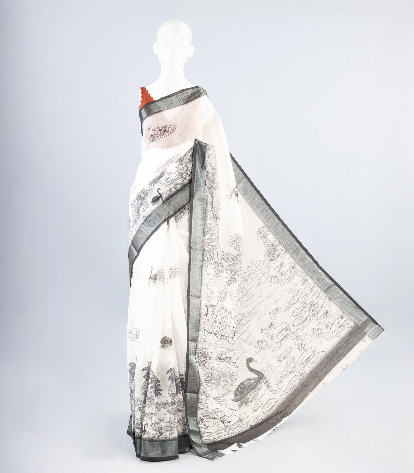 This woven art linen saree is filled with printed scenery motifs in white body along with contrast border and pallu