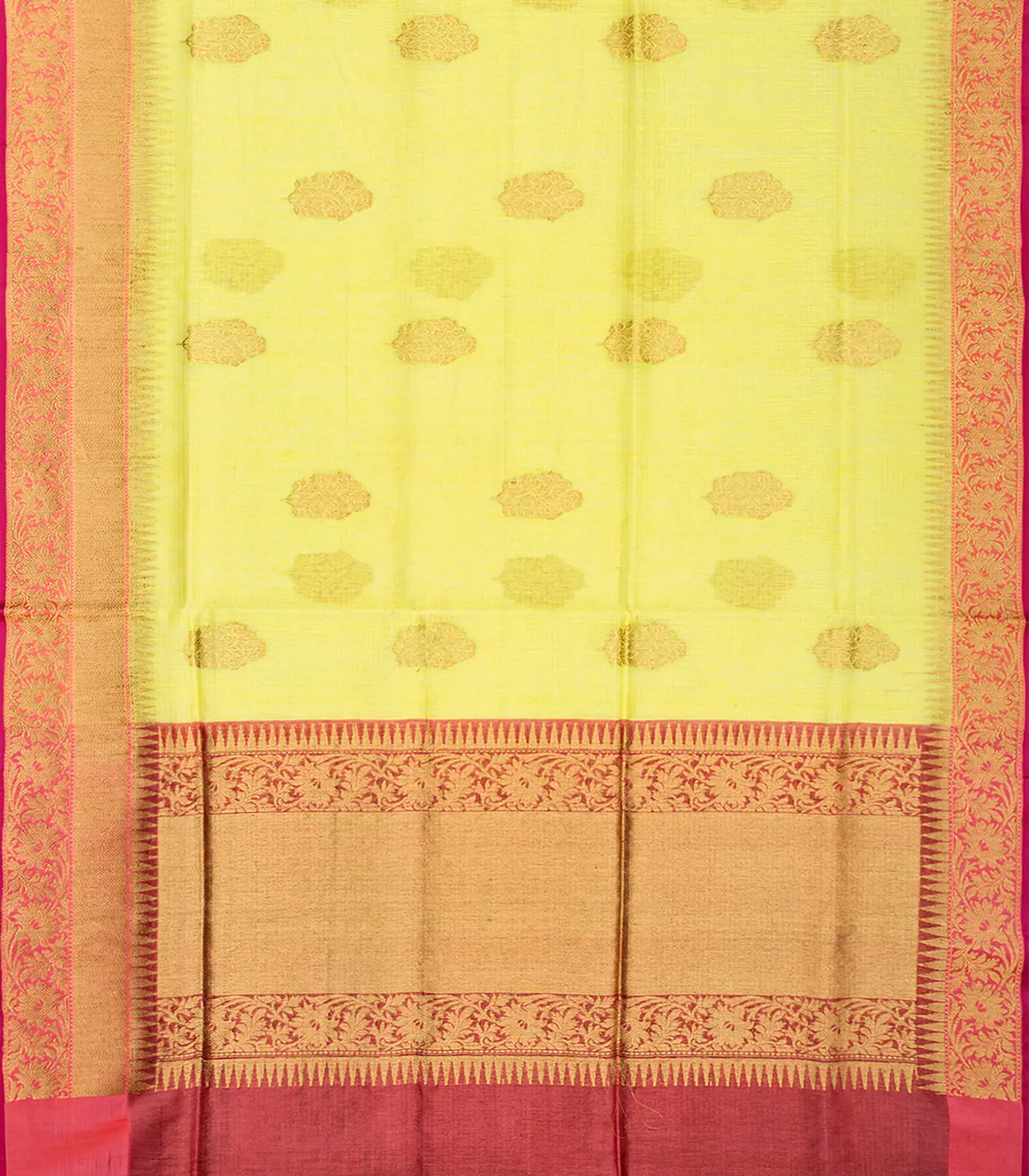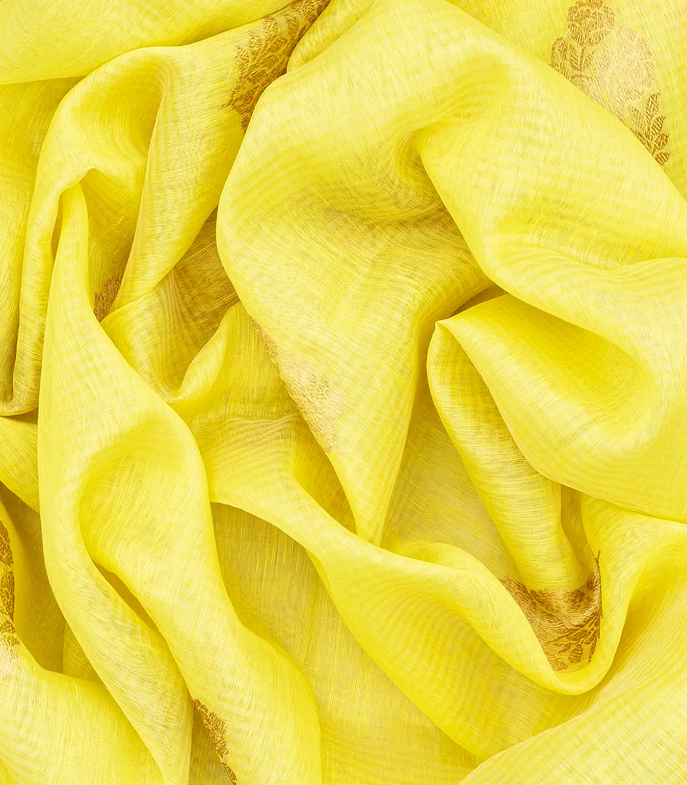 Yellow Handloom Banarasi Linen Saree With Floral Zari Buttas-Yellow