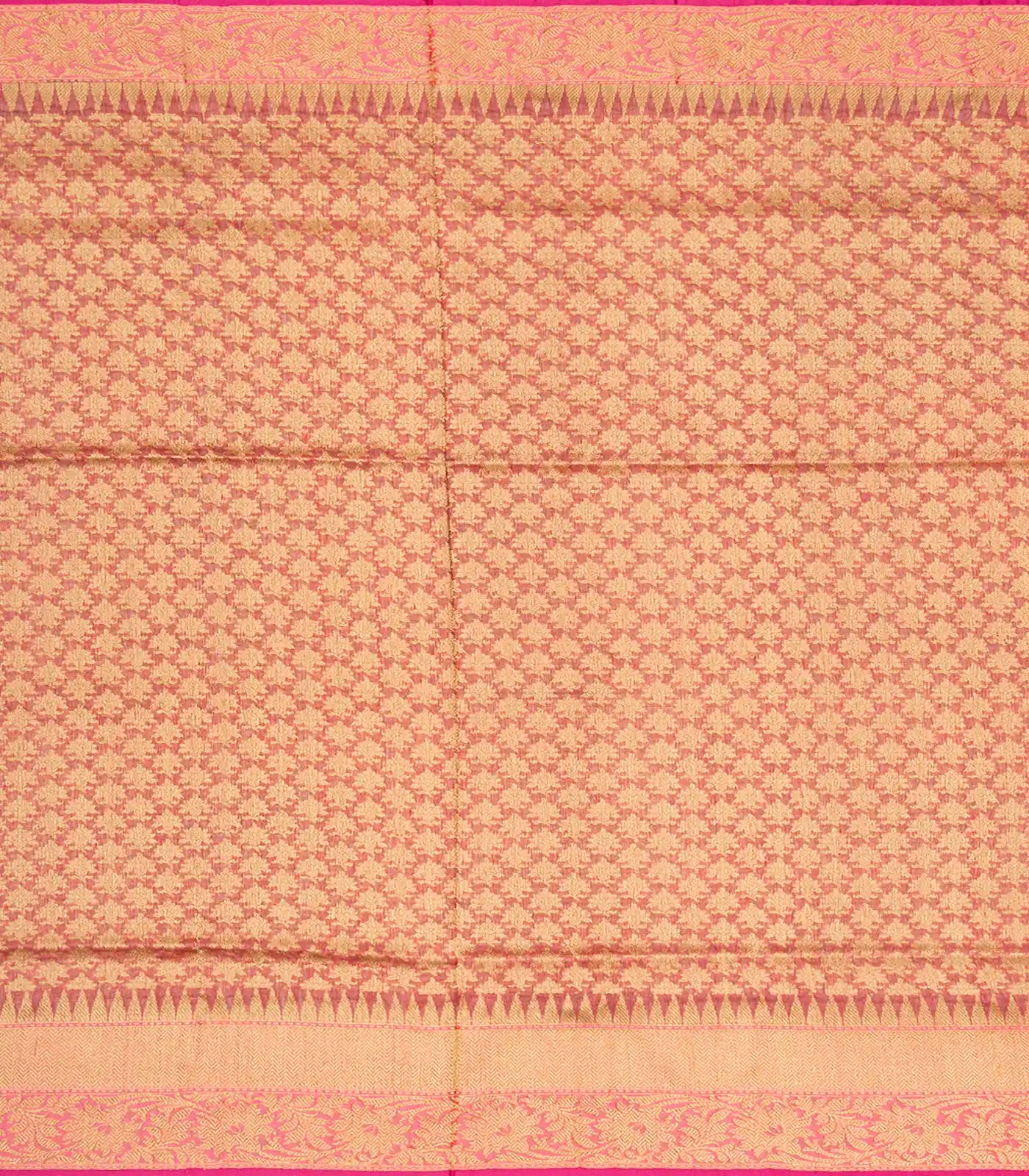 This handwoven banarasi linen saree is filled with floral zari buttas in yellow body along with peach meena border and pallu