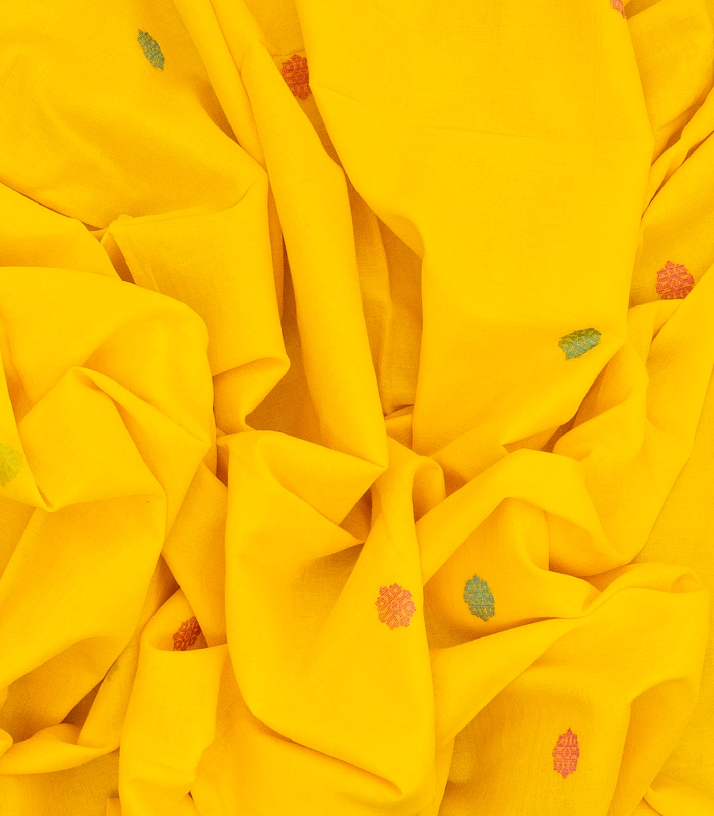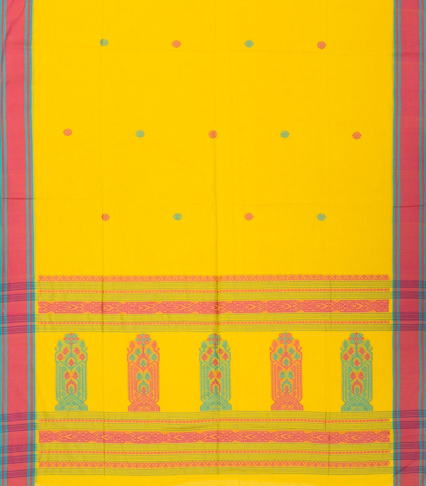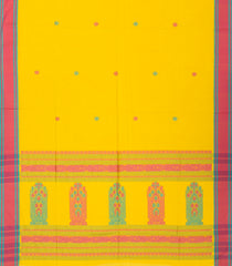This handwoven bengal cotton saree is filled with floral buttas in yellow body along with contrast border and floral pallu