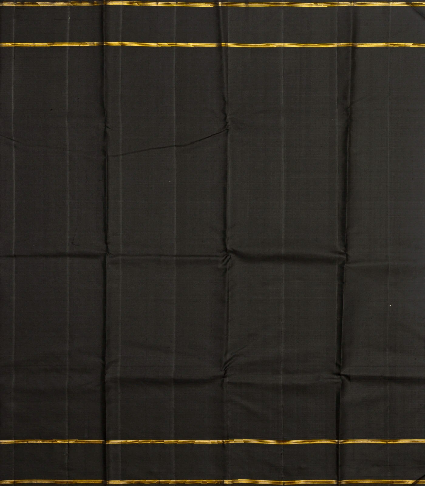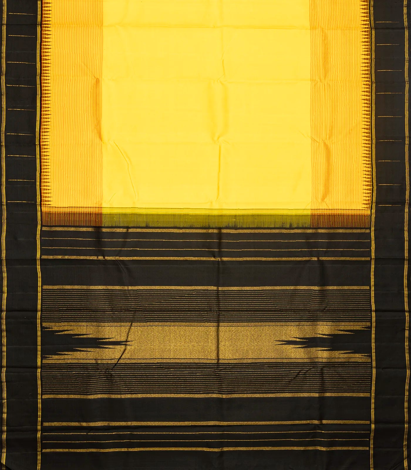 This handwoven kanchipuram korvai silk saree is filled with plain & stripes yellow black body along with contrast black temple border and pallu