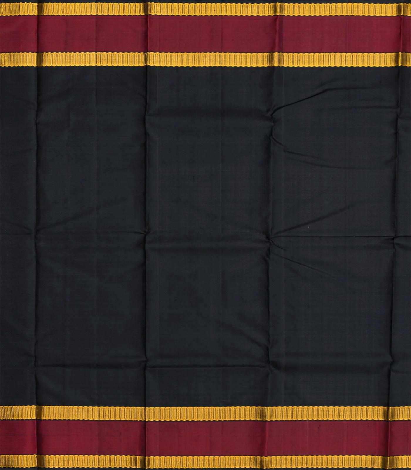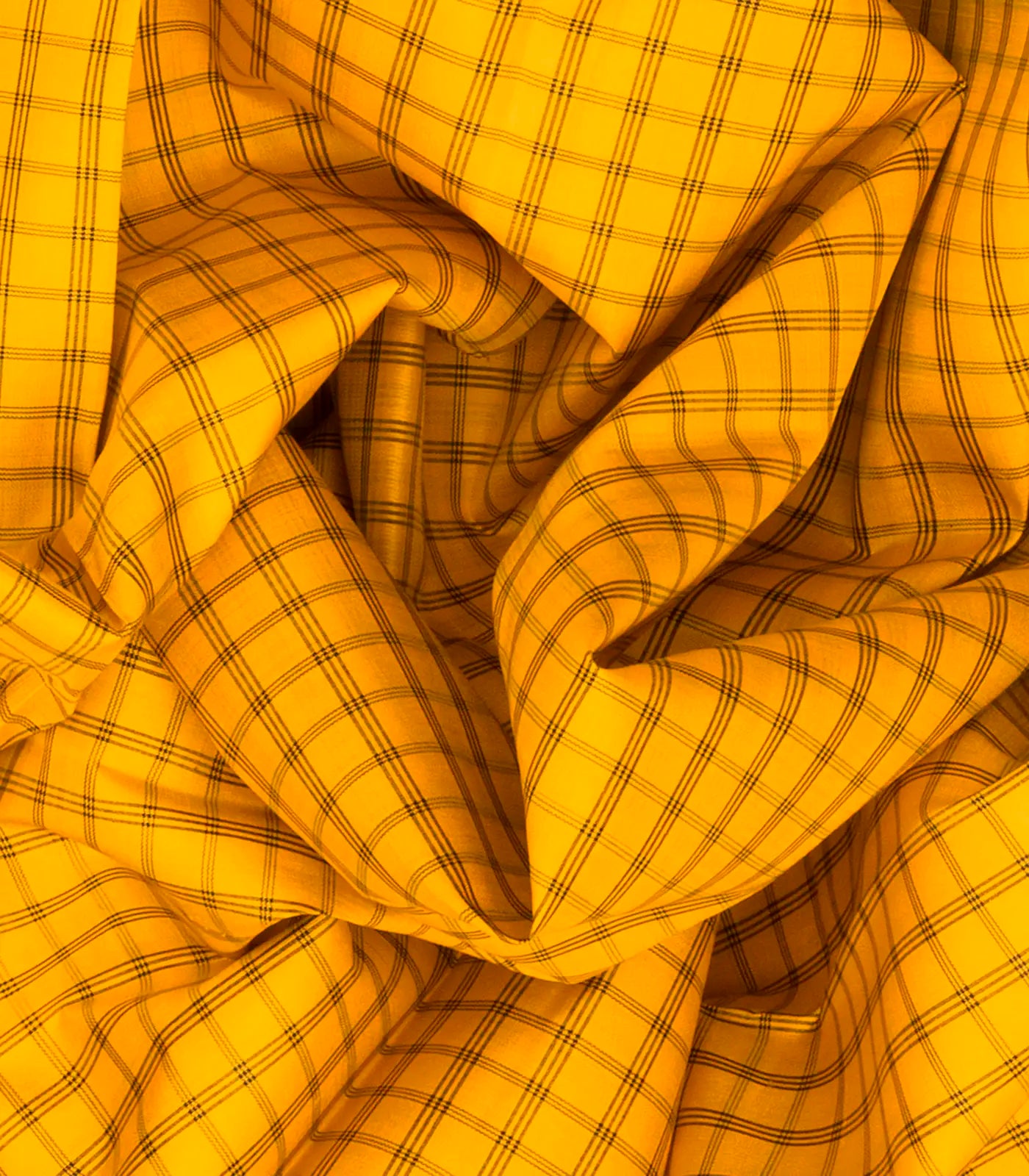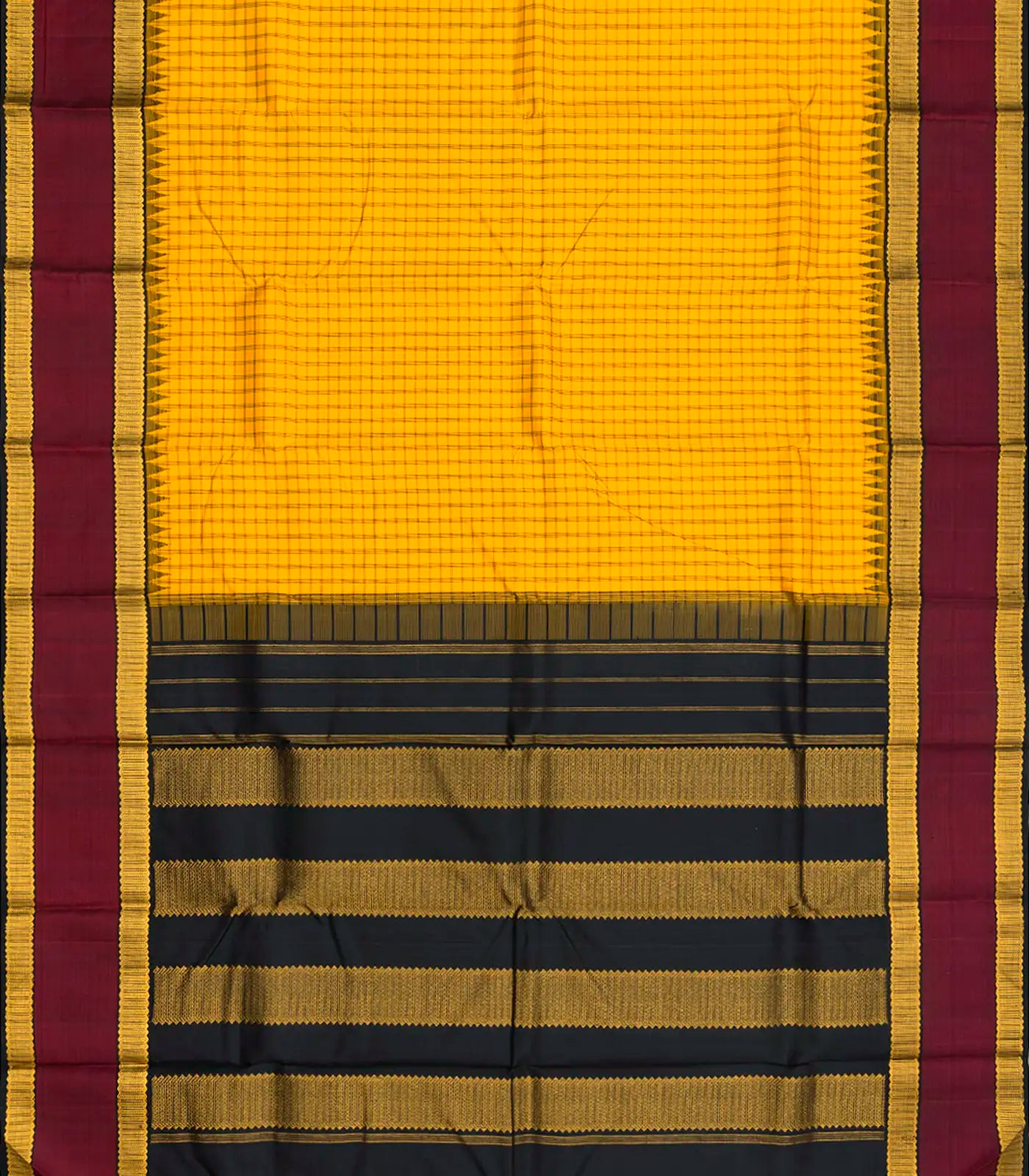 This handwoven kanchipuram silk saree is filled with checks in yellow body along with contrast black temple border and pallu