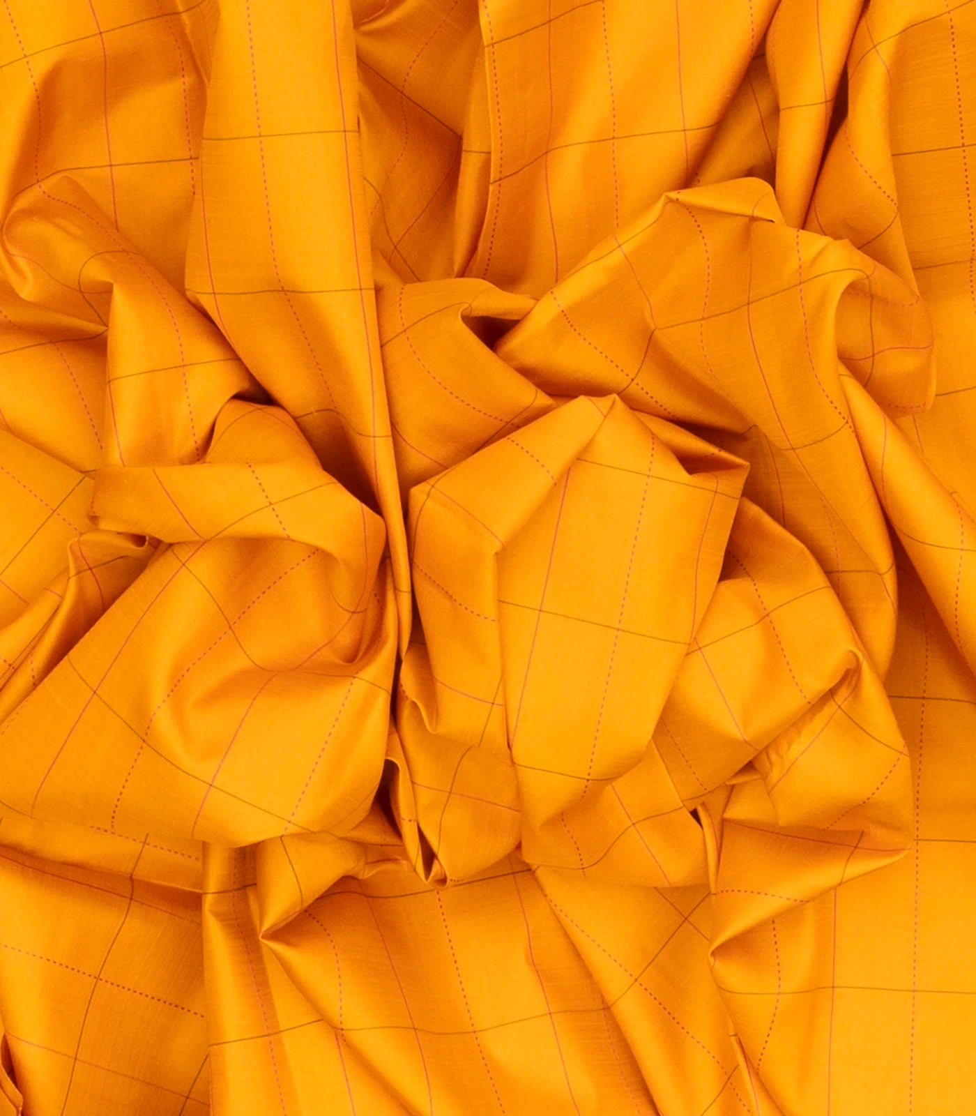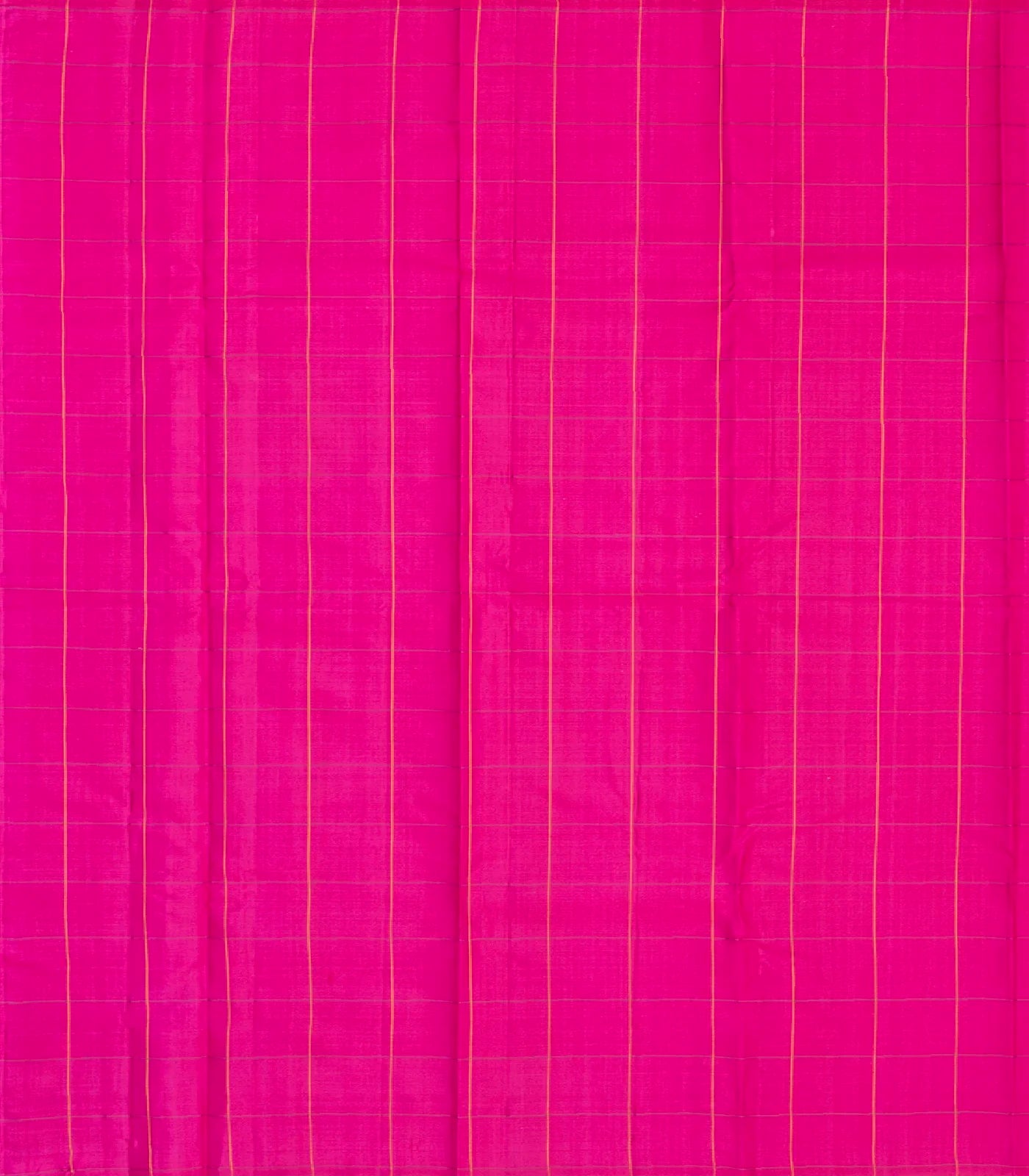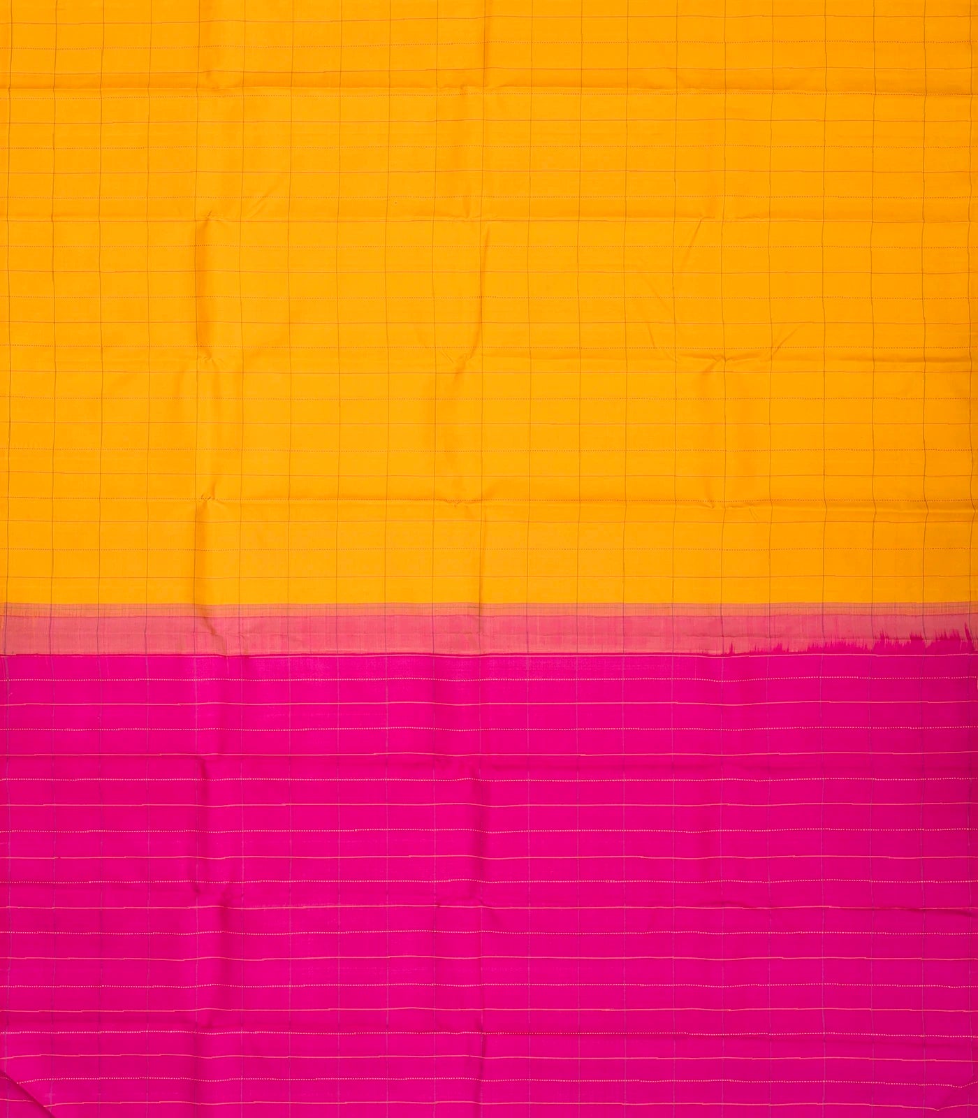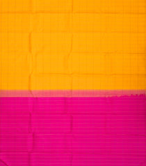 This handwoven kanchipuram silk saree is filled with checks in yellow body along with contrast pink pallu