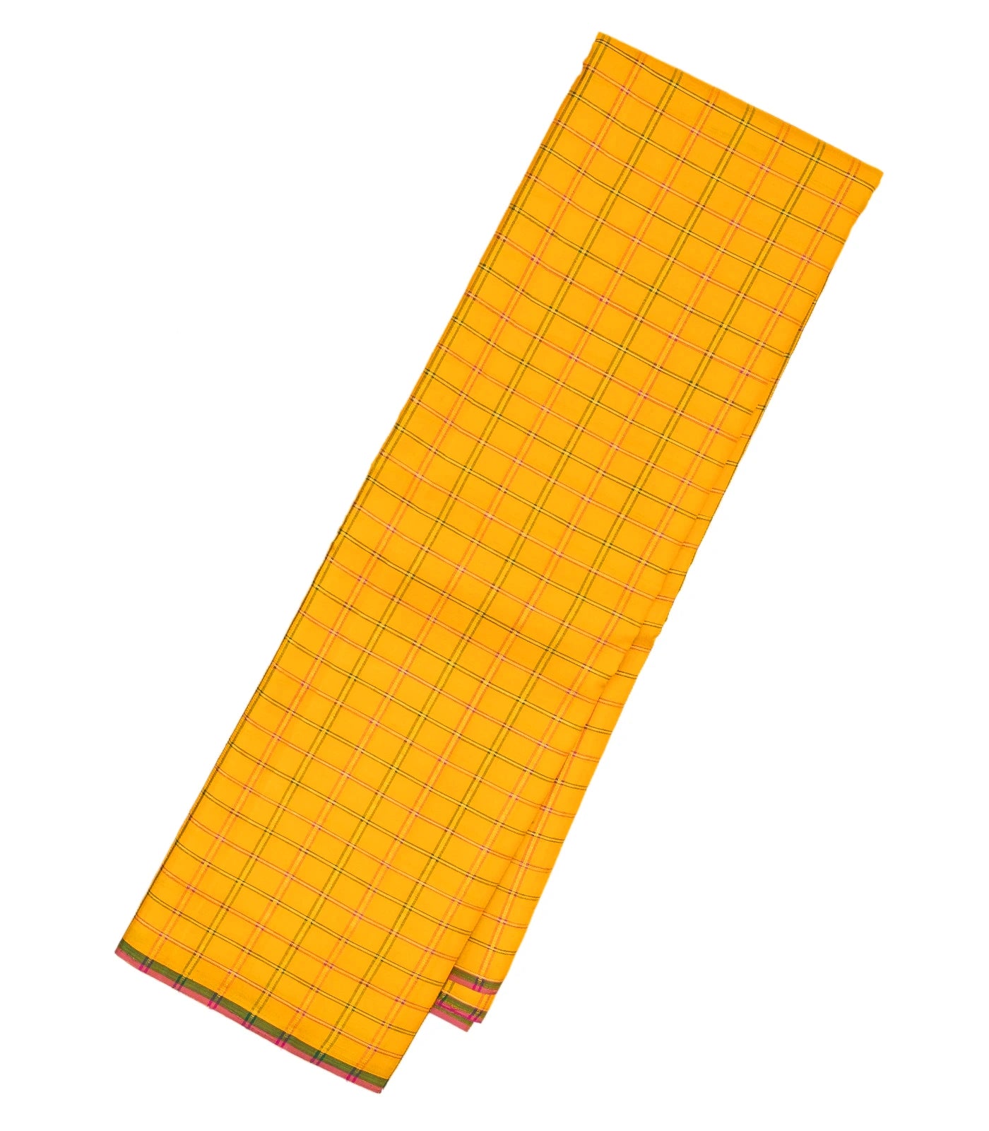 This handwoven kanchipuram silk saree with checks in yellow body along with pallu