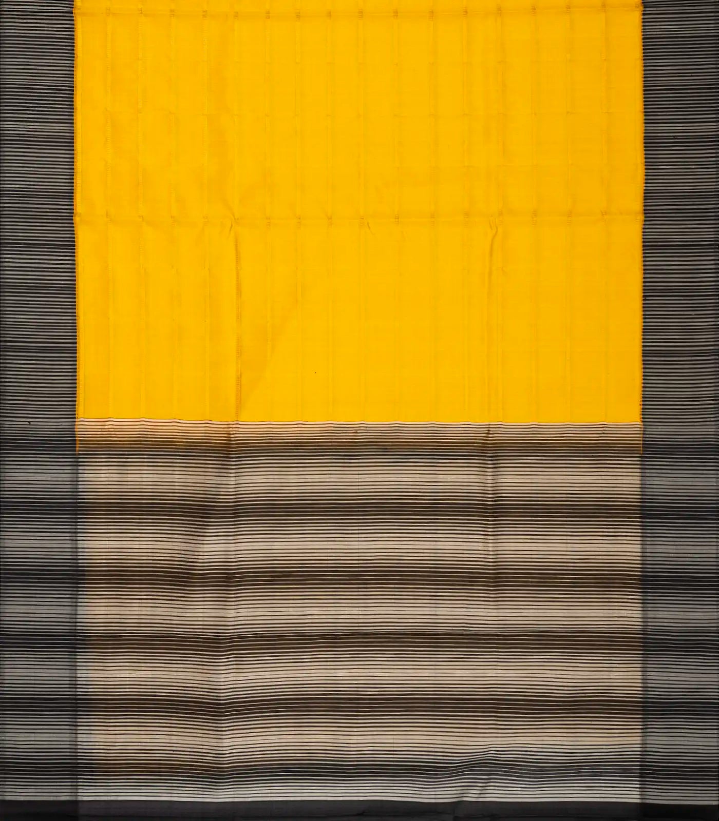 This handwoven kora silk by silk saree is filled with beldari stripes in yellow body along with silk stripes in black border and pallu