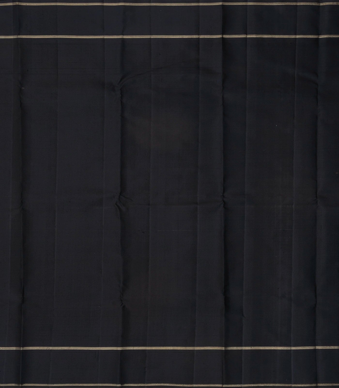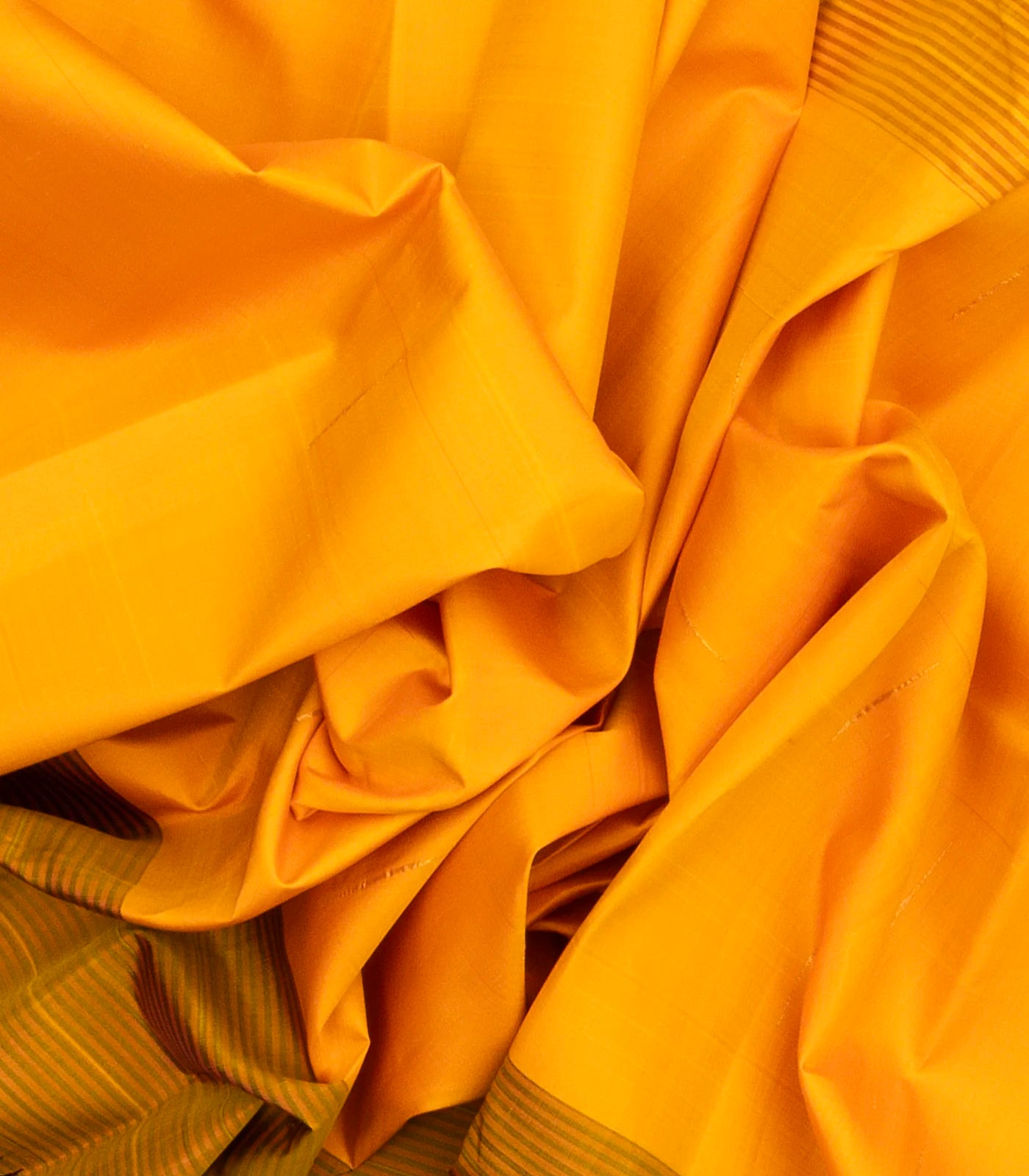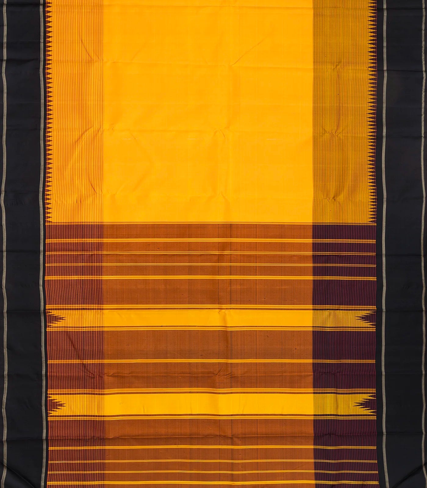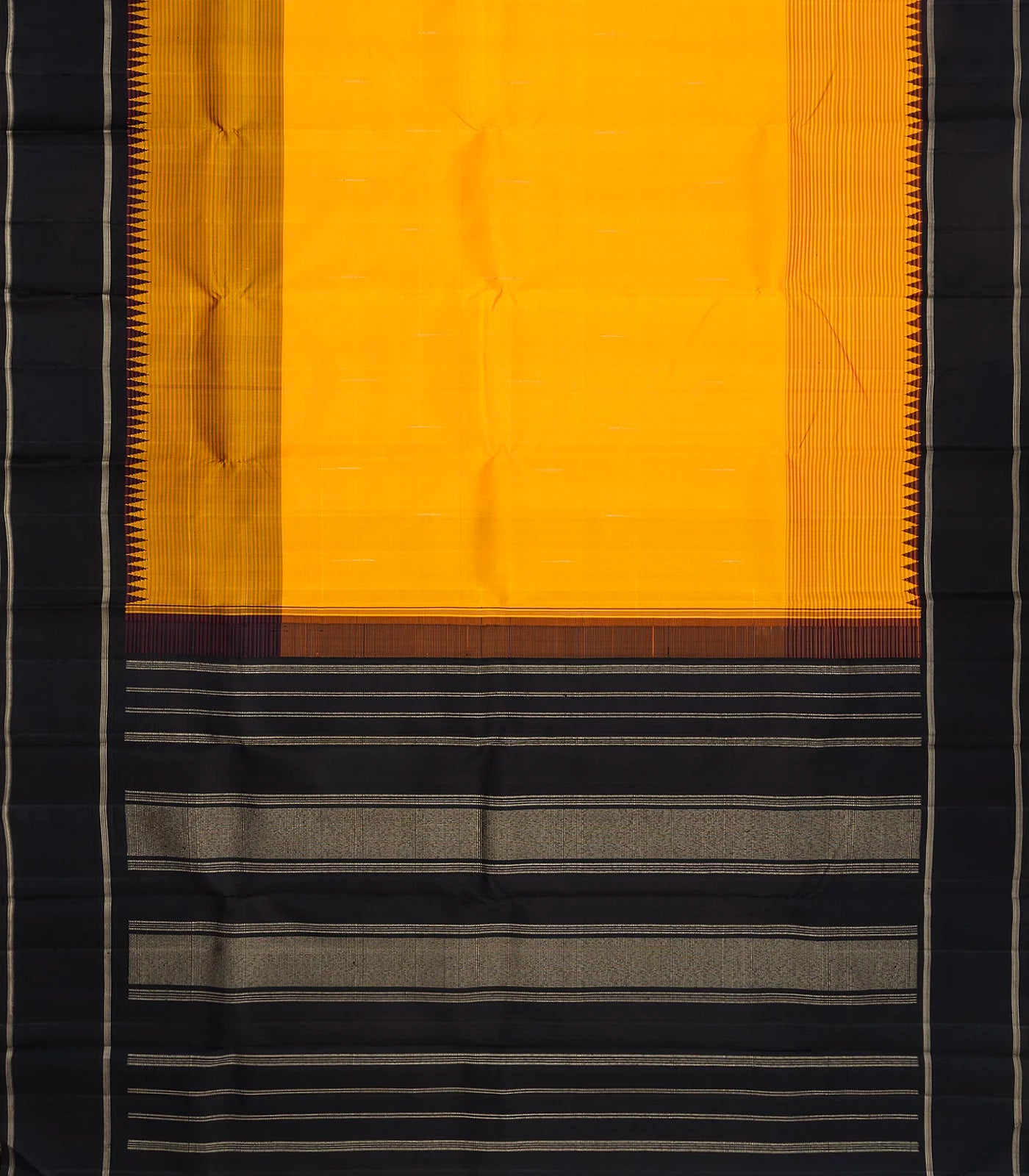 This handwoven korvai kanchipuram silk saree is filled with plain and stirpes in yellow body along with contrast black temple border and pallu