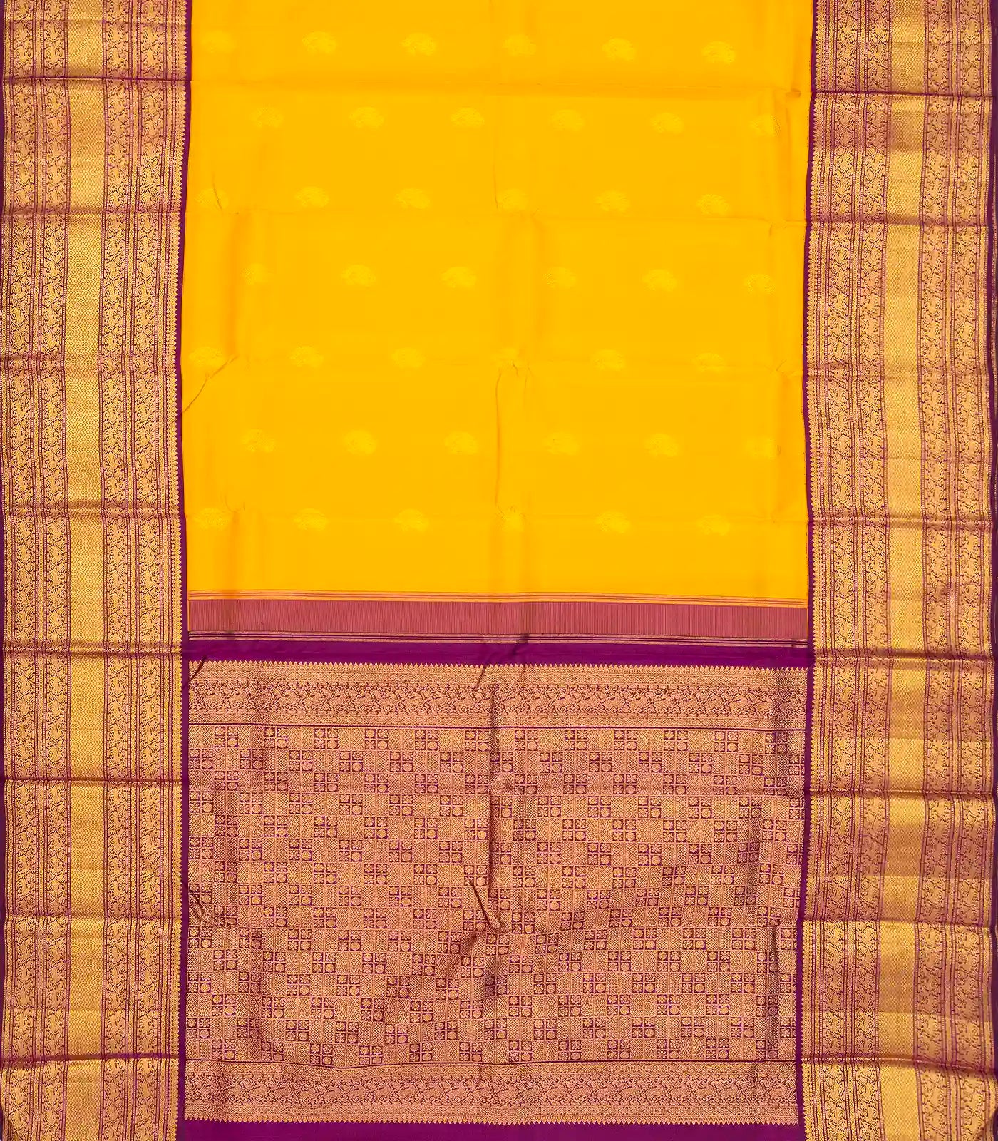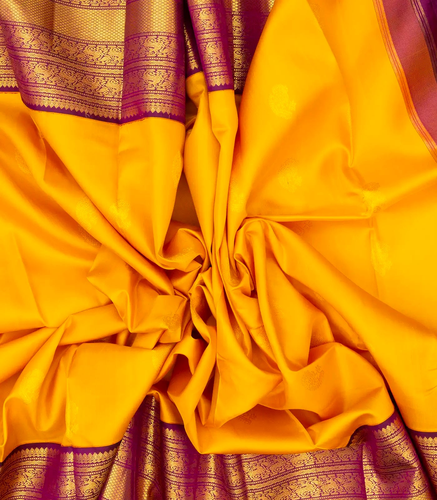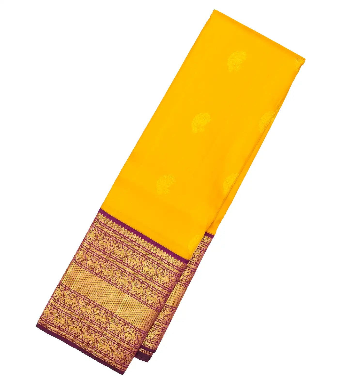 This handwoven korvai kanchipuram silk saree is filled with zari buttas in yellow body along with contrast magenta border and pallu