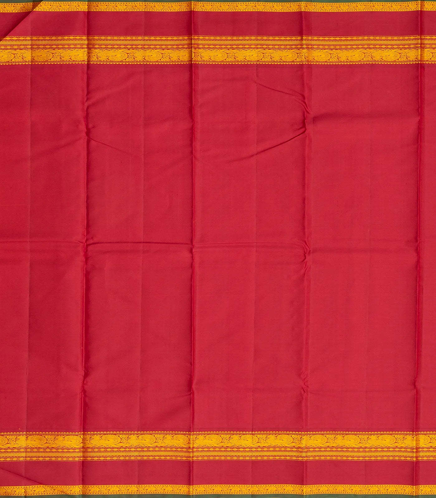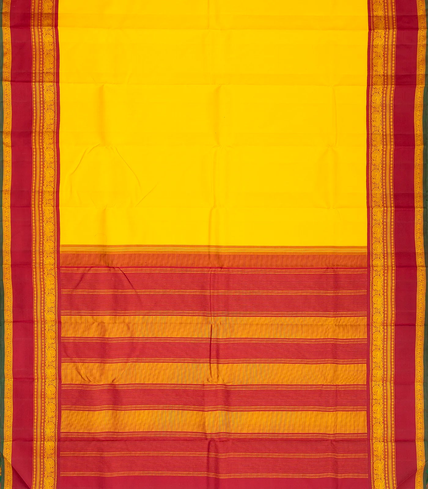 This handwoven korvai kanchipuram silk saree is filled with plain yellow body along with contrast crimson border and pallu
