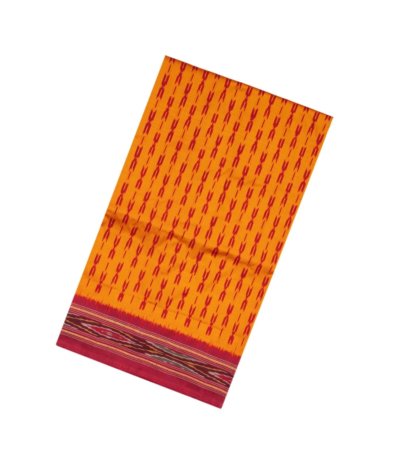 This handwoven pochampally ikat silk saree is filled with tie & dye motifs in yellow body along with tie & dye floral motifs in contrast border and pallu