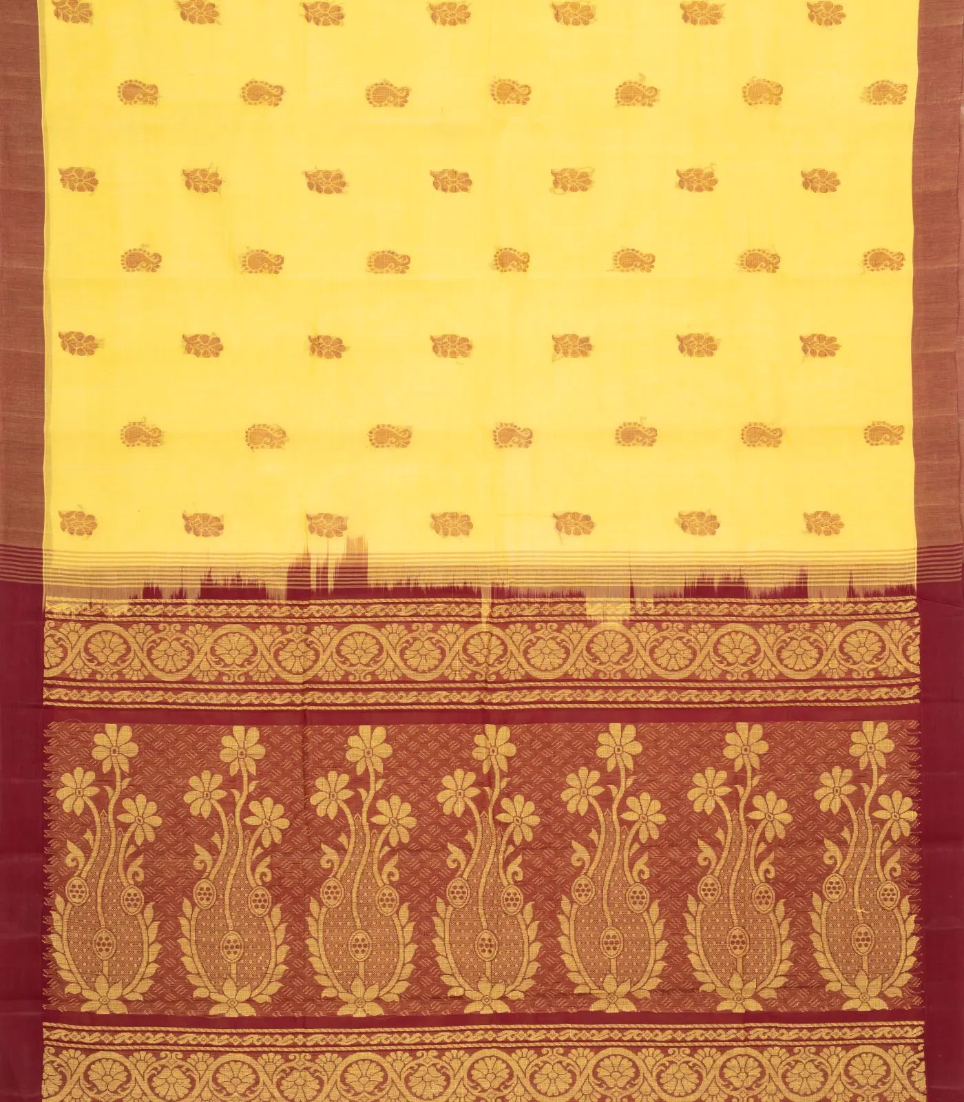 This handwoven rasipuram cotton saree is filled with floral buttas in yellow body along with contrast border and pallu