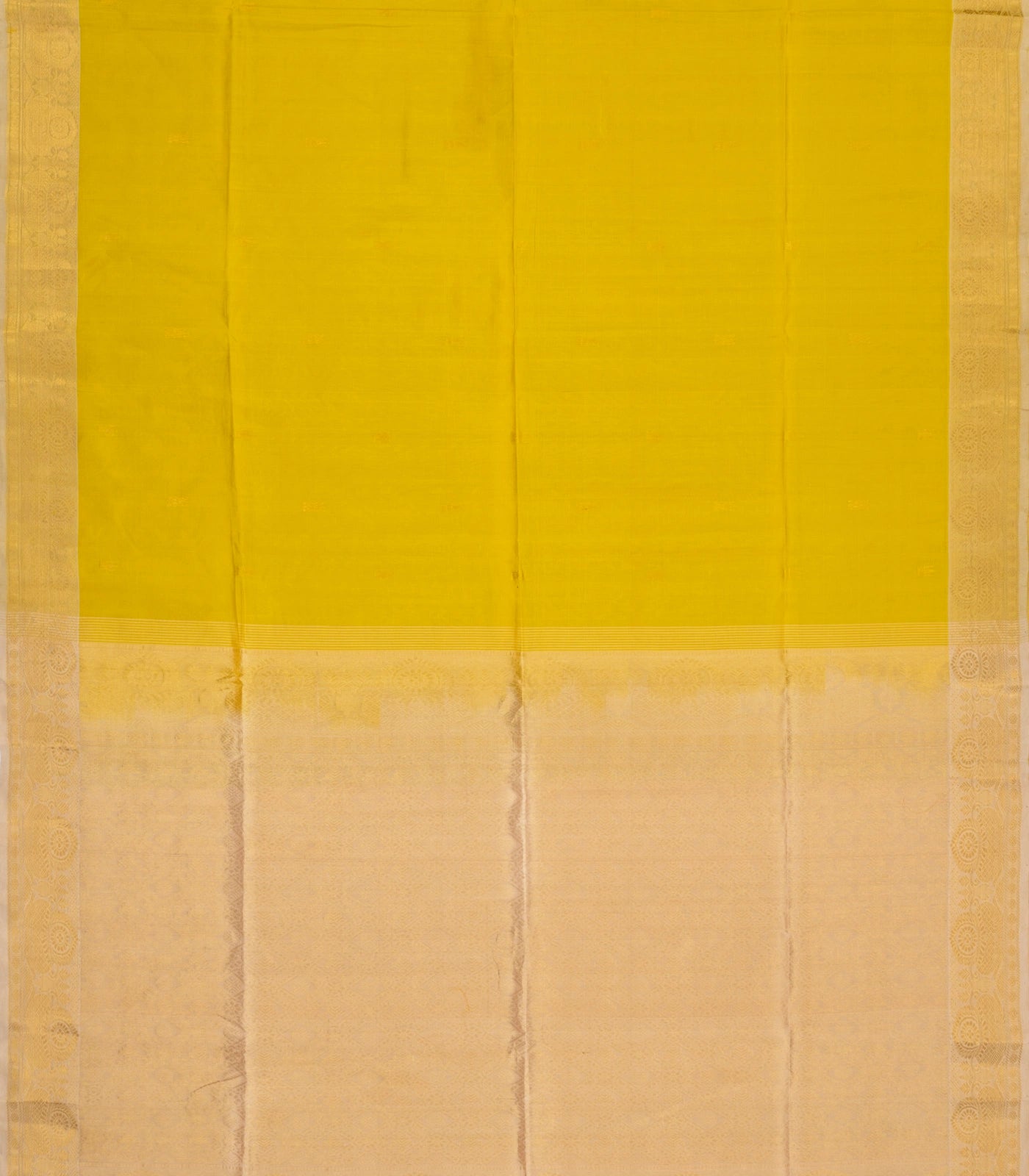This handwoven silk cotton saree is filled with floral buttas in yellow body along with border and contrast pallu