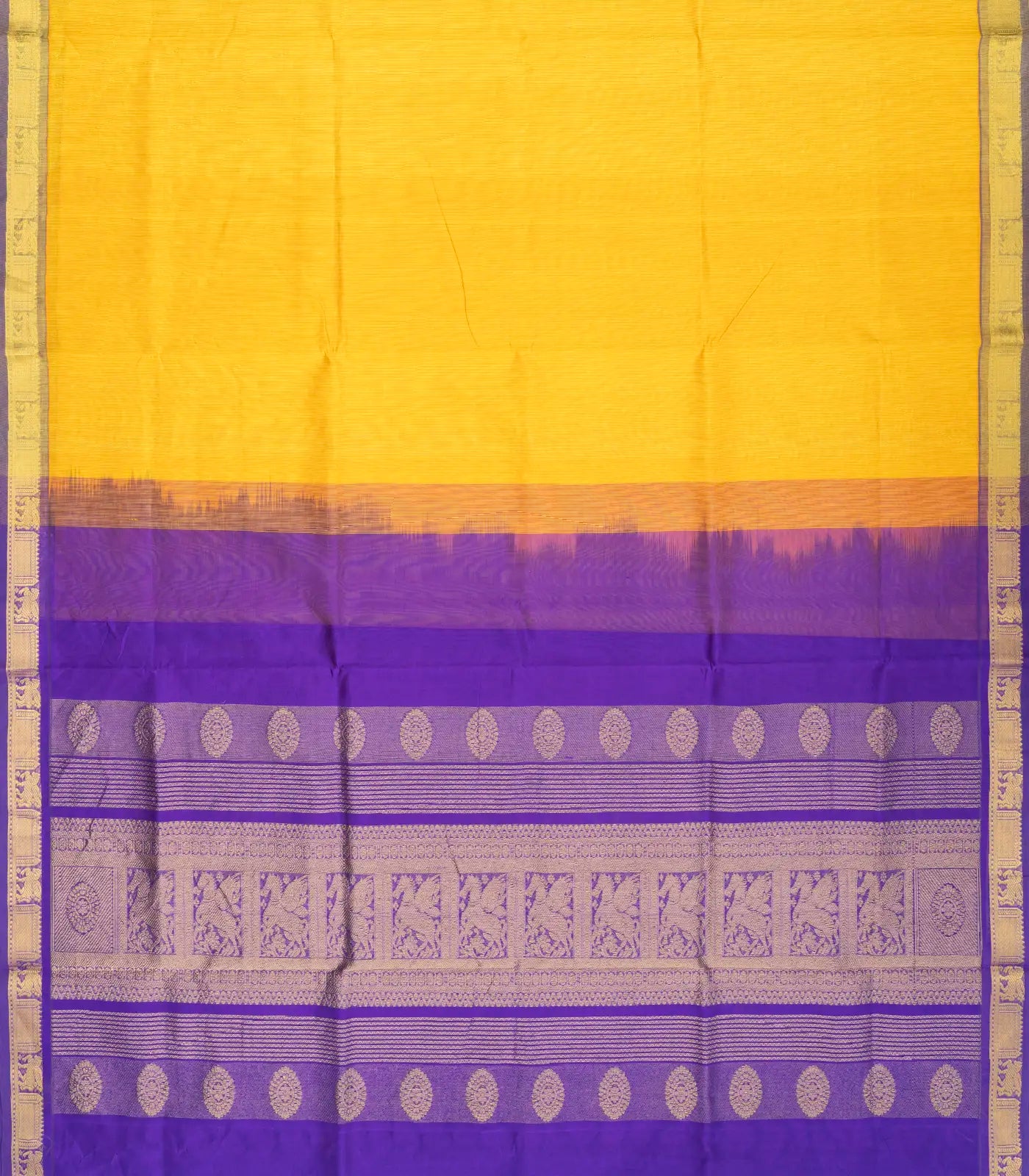This handwoven silk cotton saree is filled with stripes in yellow body along with contrast border and pallu