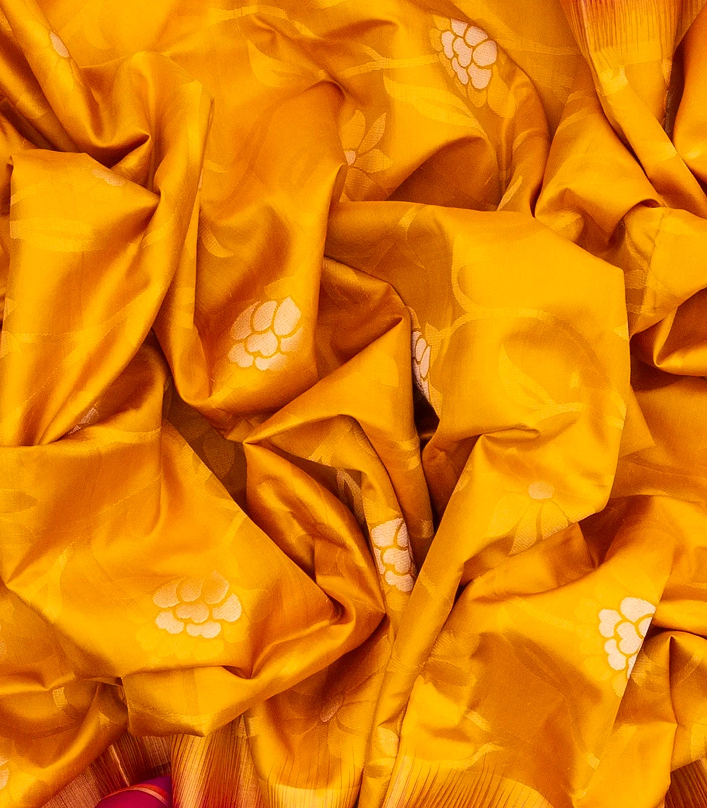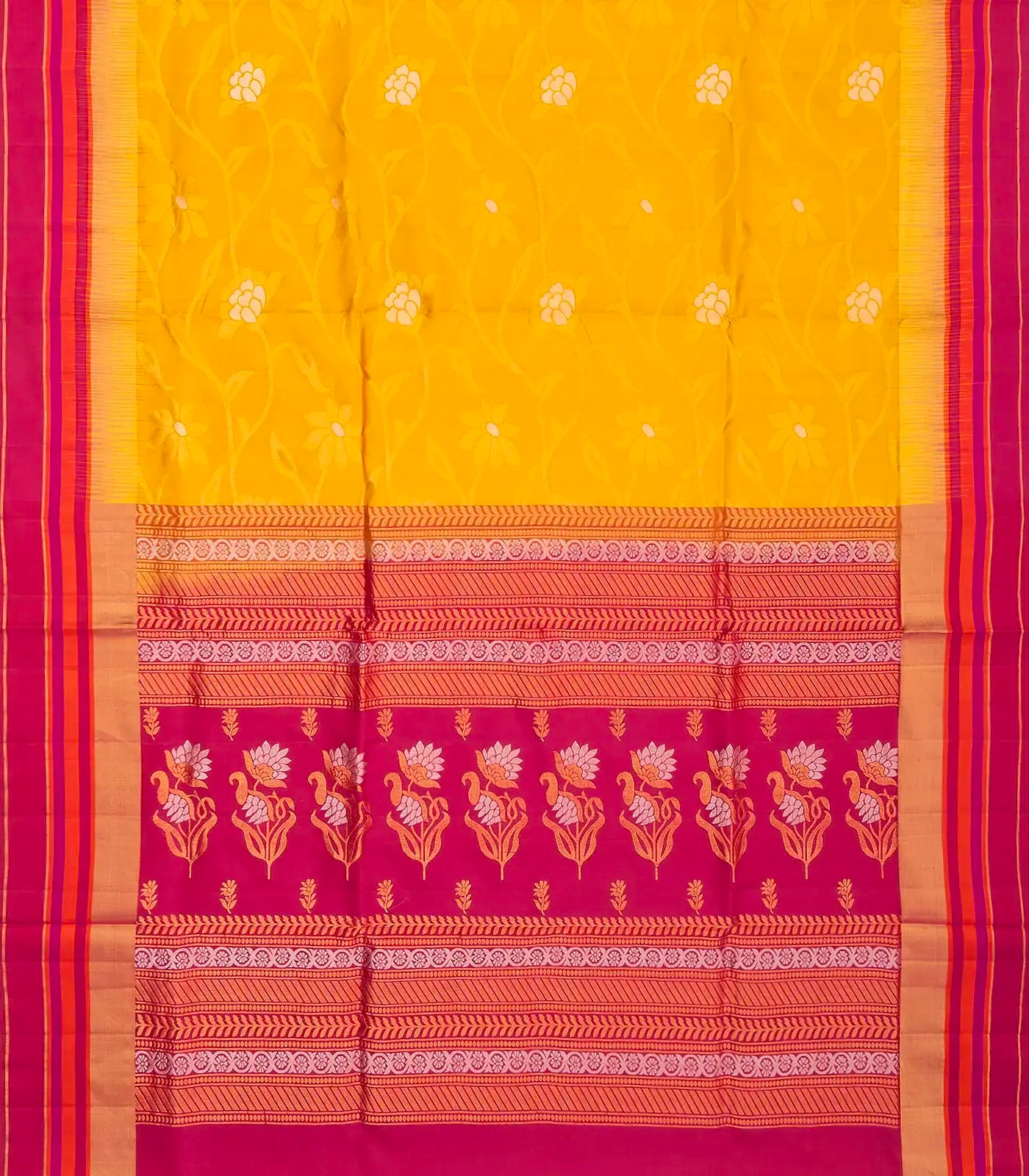 This handwoven soft silk saree is filled with floral vine motifs in yellow body along with contrast pink border and pallu