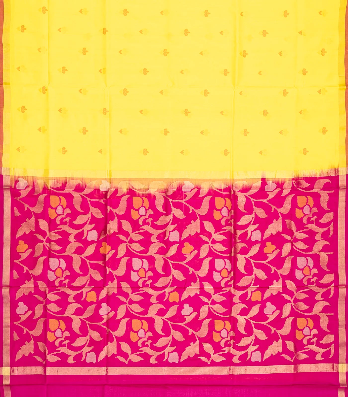 This handwoven uppada silk saree is filled with floral buttas in yellow body along with contrast pink border and pallu