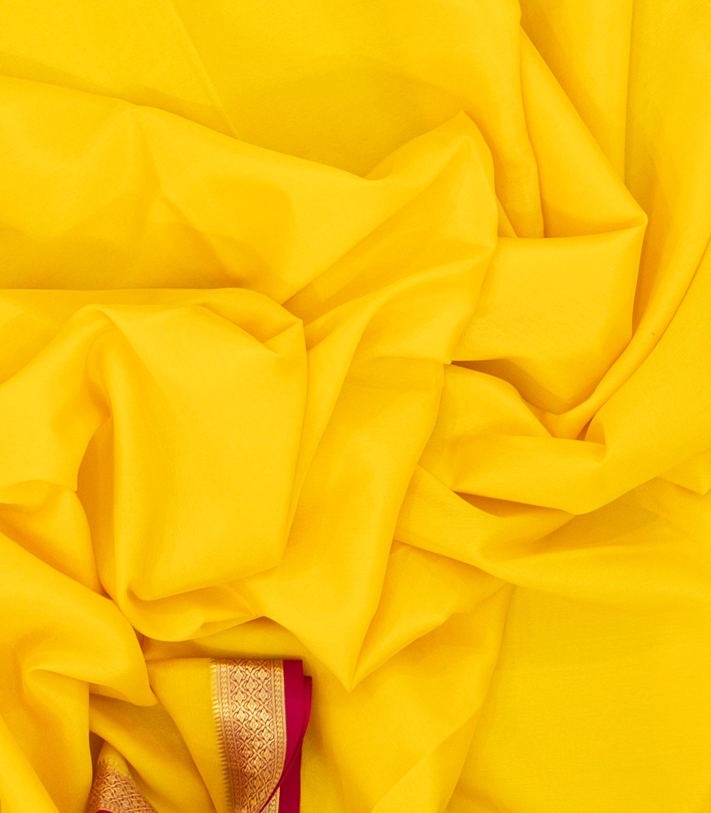 This woven mysore crepe silk saree is filled with plain yellow body along with contrast zari border and pallu