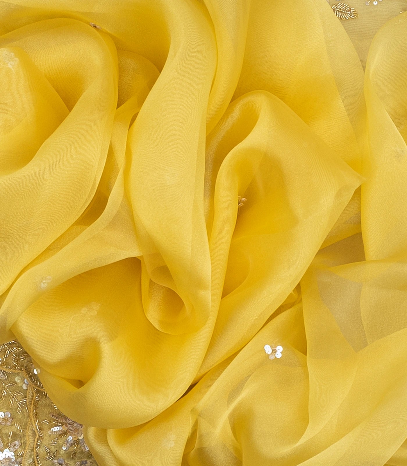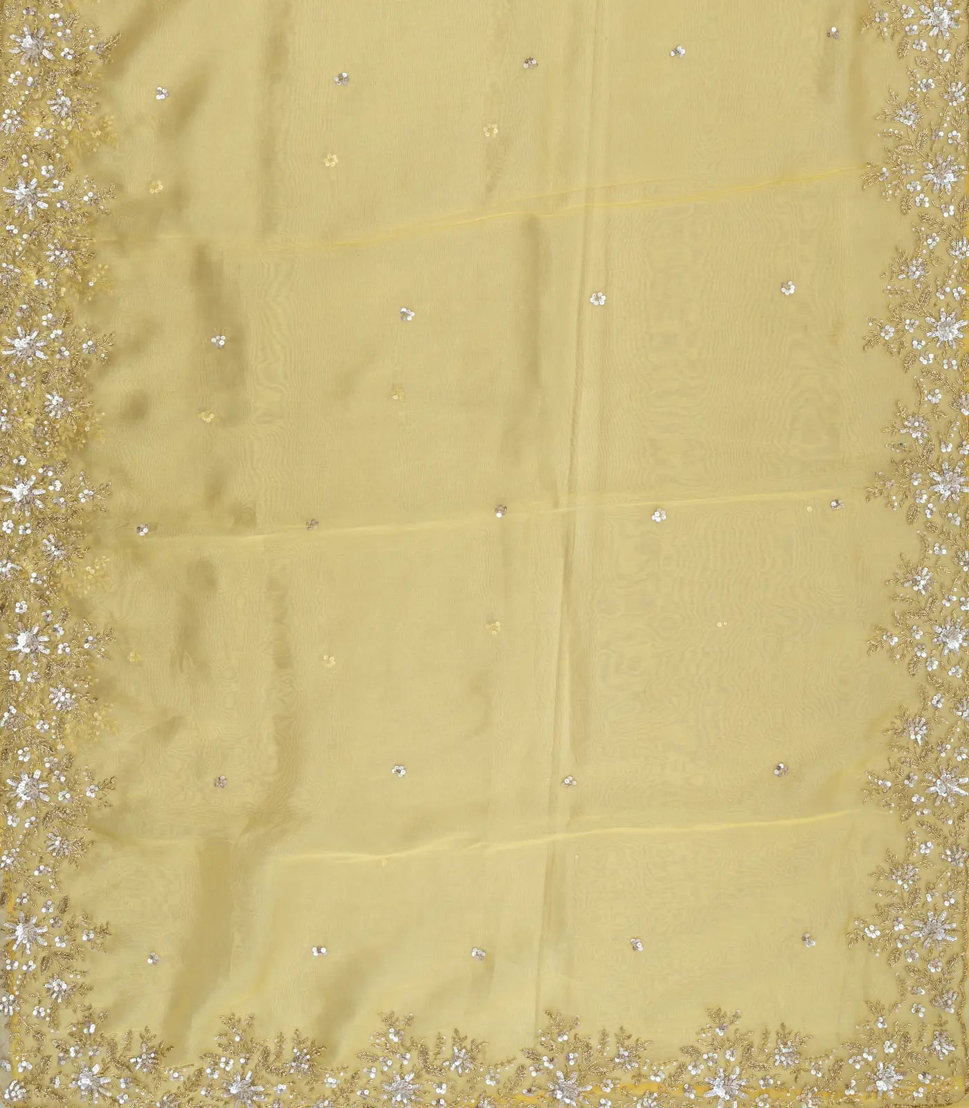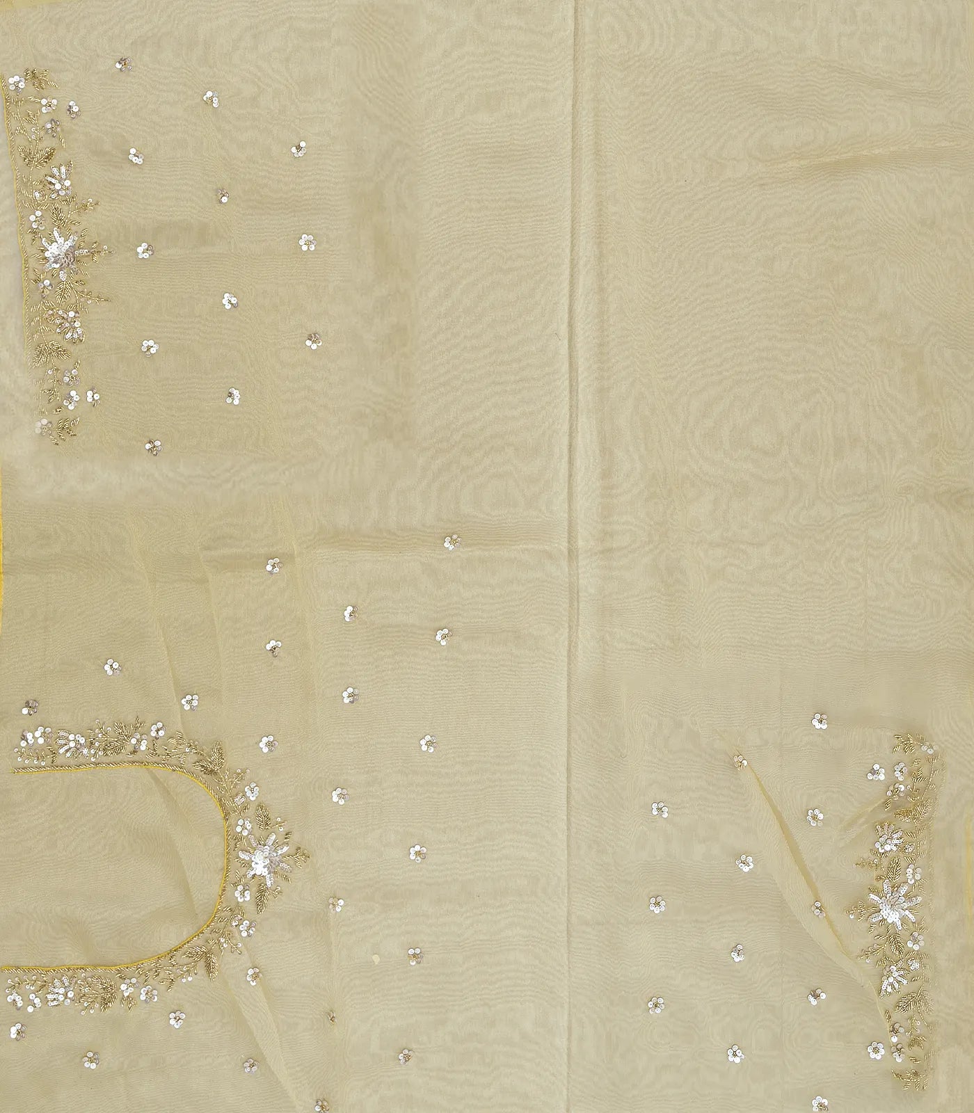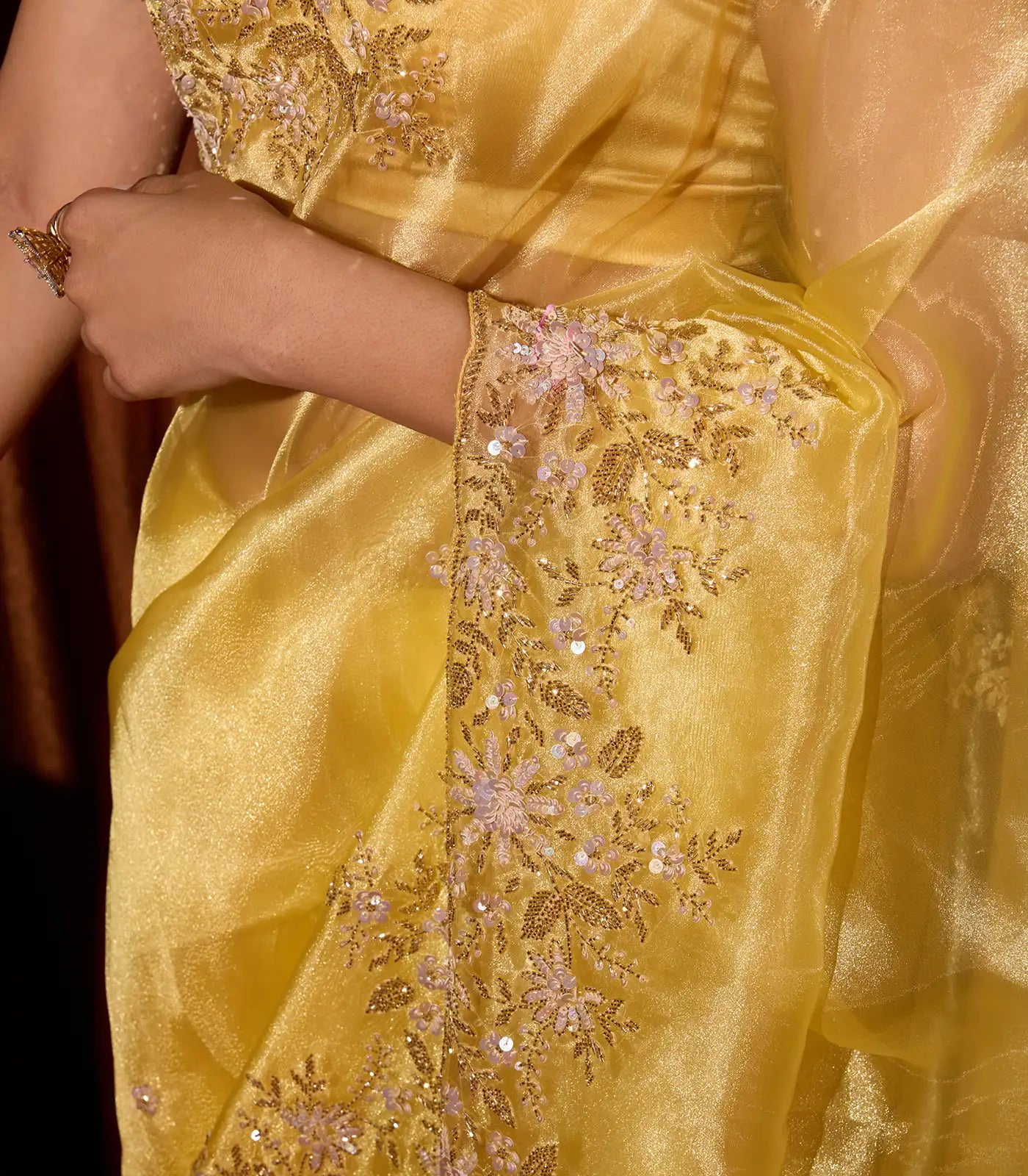 Yellow Woven Organza Saree With Embroidered Mirror Work & Floral Motifs-EN1808