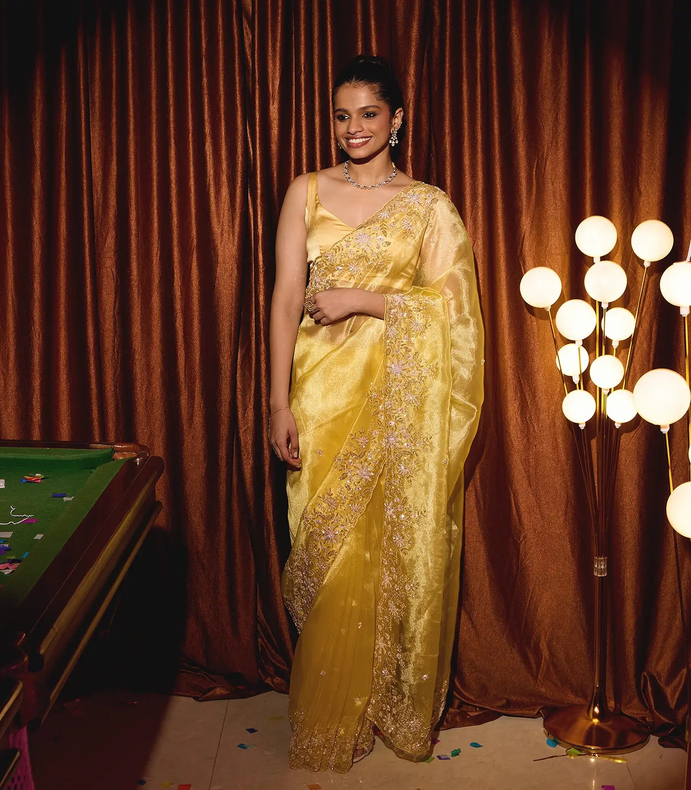 This woven organza saree is filled with embroidered floral motifs in yellow body along with border and pallu