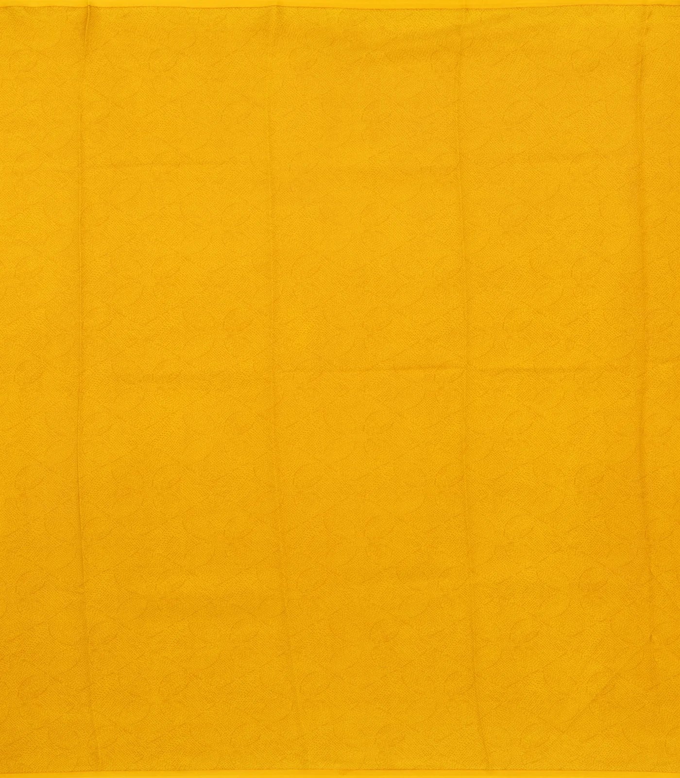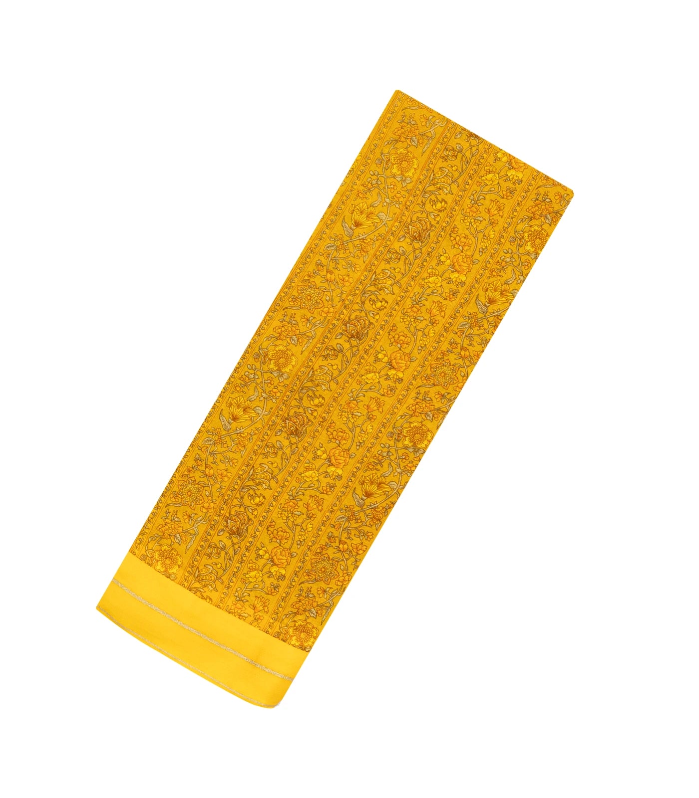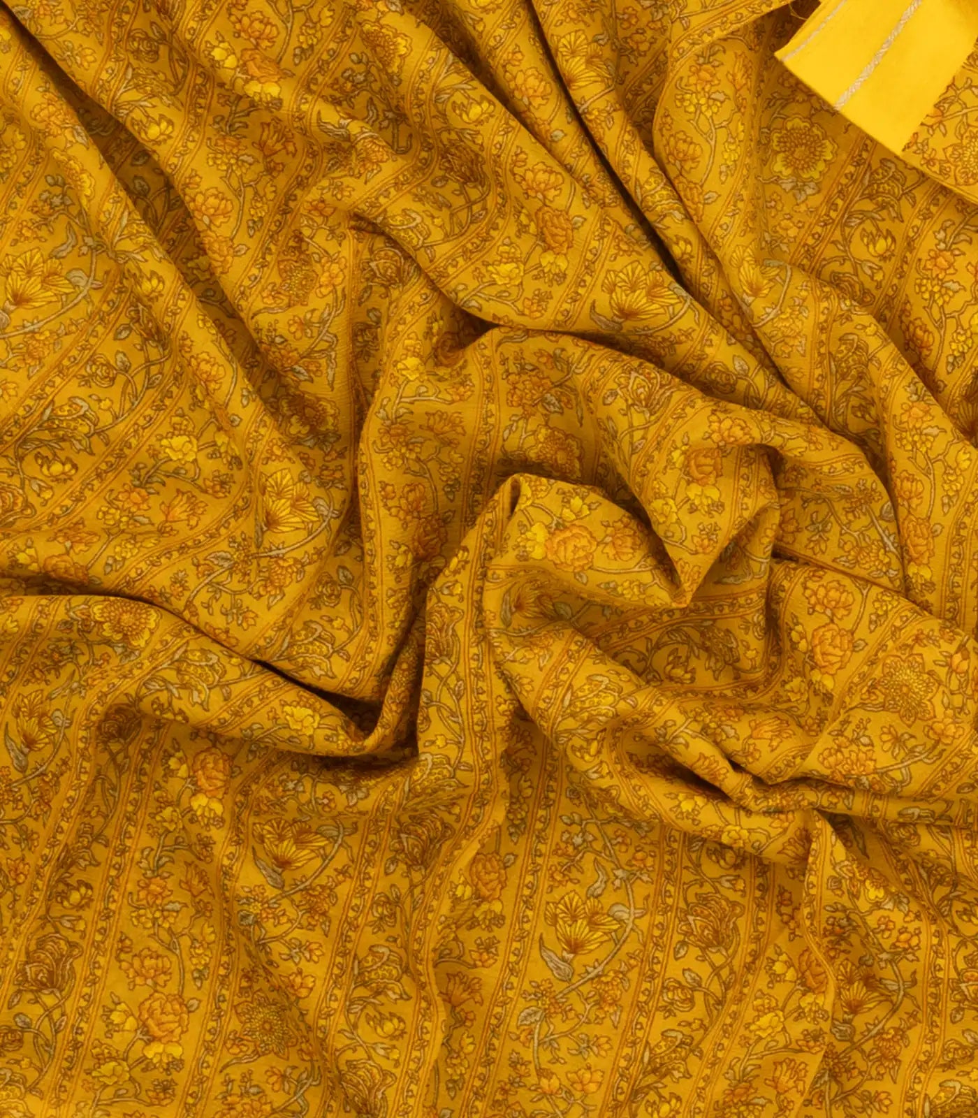 This woven pure silk saree is filled with printed floral motifs in yellow body along with border and pallu