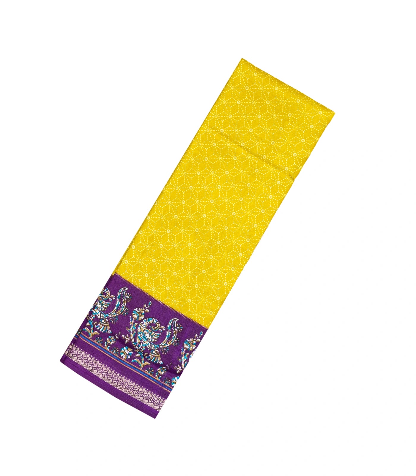 This woven synthetic crackle saree is filled with printed geometric & bird motifs in yellow body along with contrast border and pallu